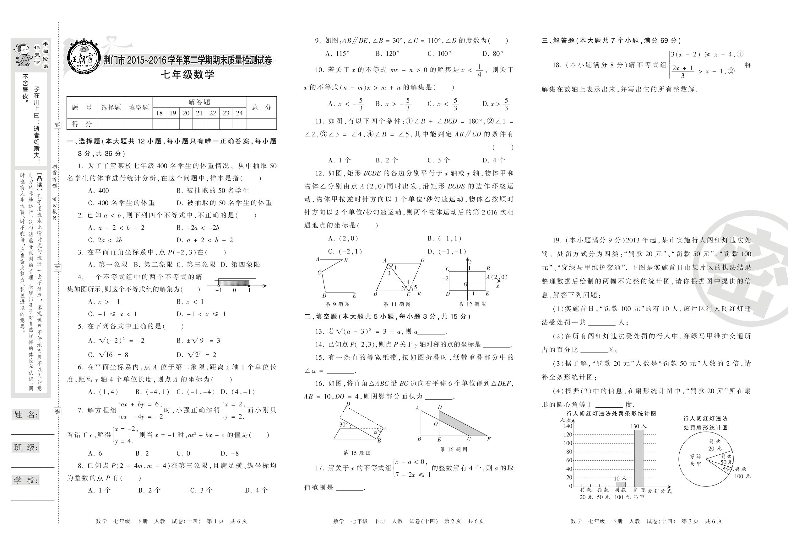 2015-2016学年第二学期荆门市七年级数学试卷(人教版)【14】
