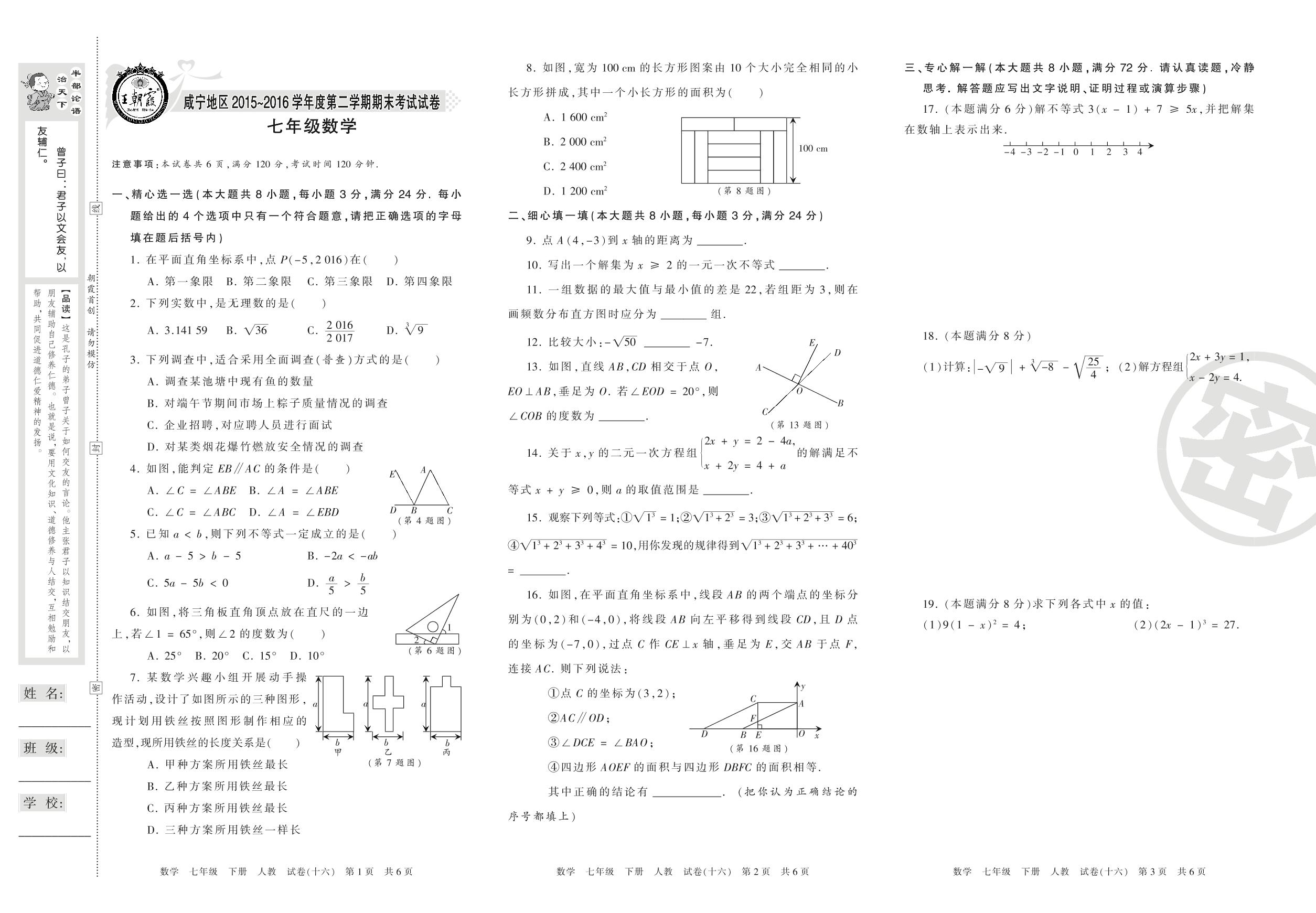 2015-2016学年第二学期咸宁市咸宁地区七年级数学试卷(人教版)【16】