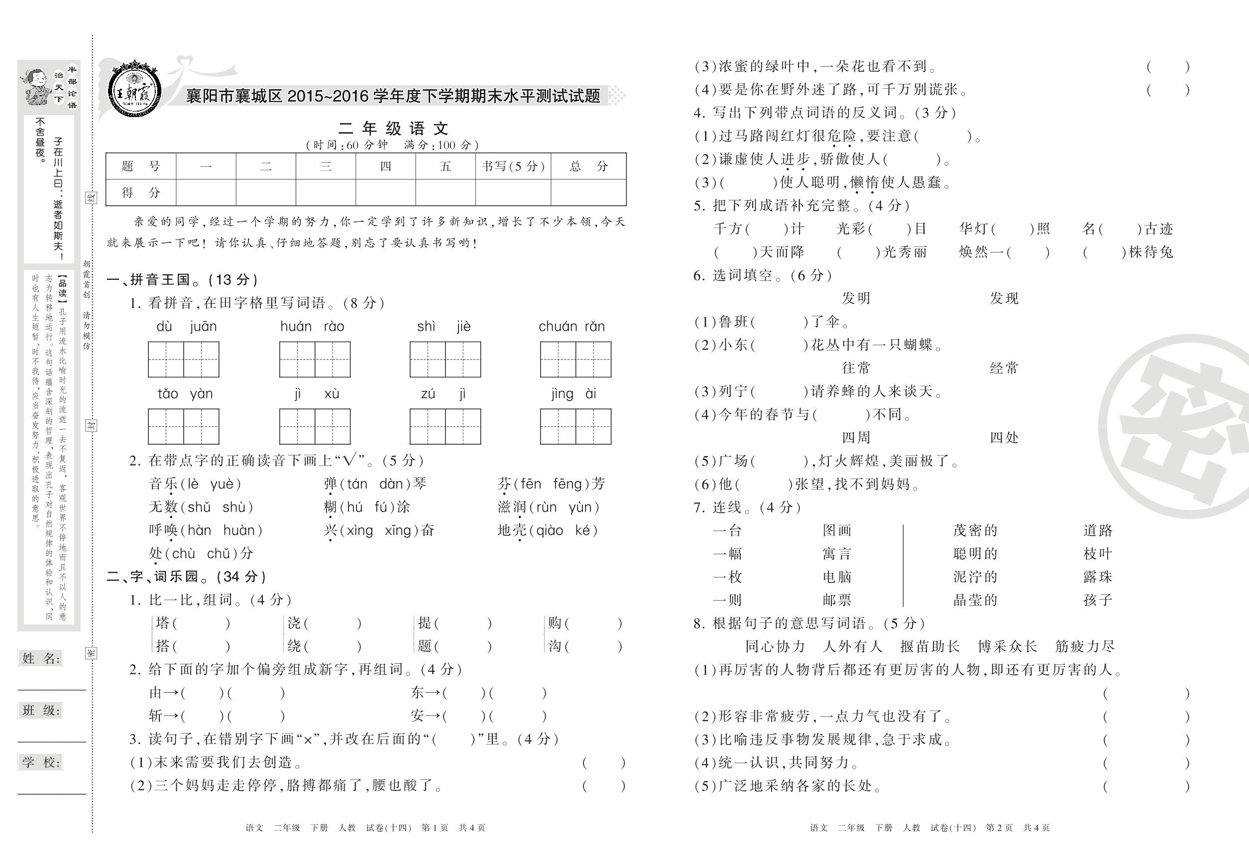 2015-2016学年第二学期襄阳市襄城区二年级语文试卷(人教版)【14】