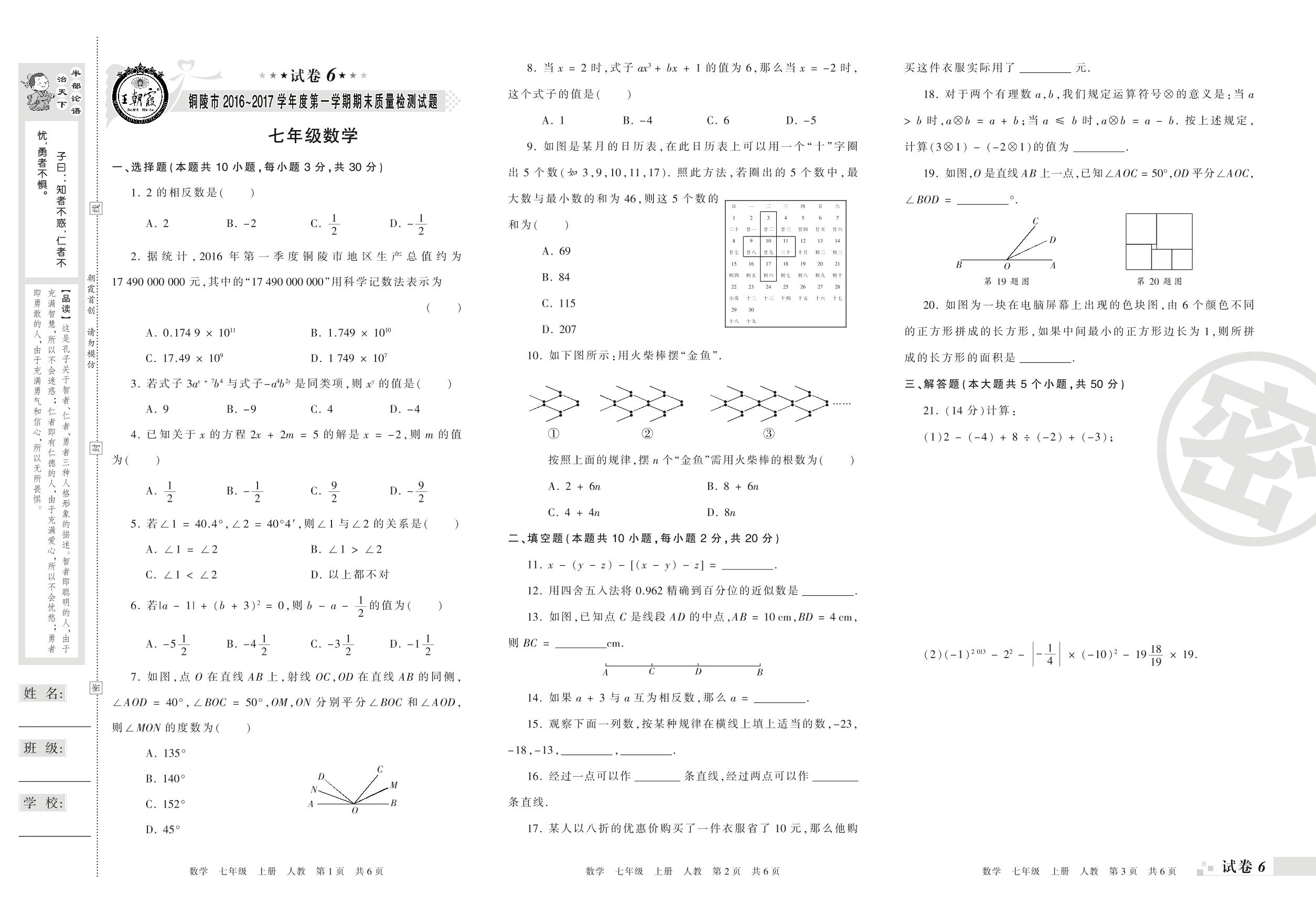 2016-2017学年第一学期铜陵市七年级数学试卷(人教版)【6】