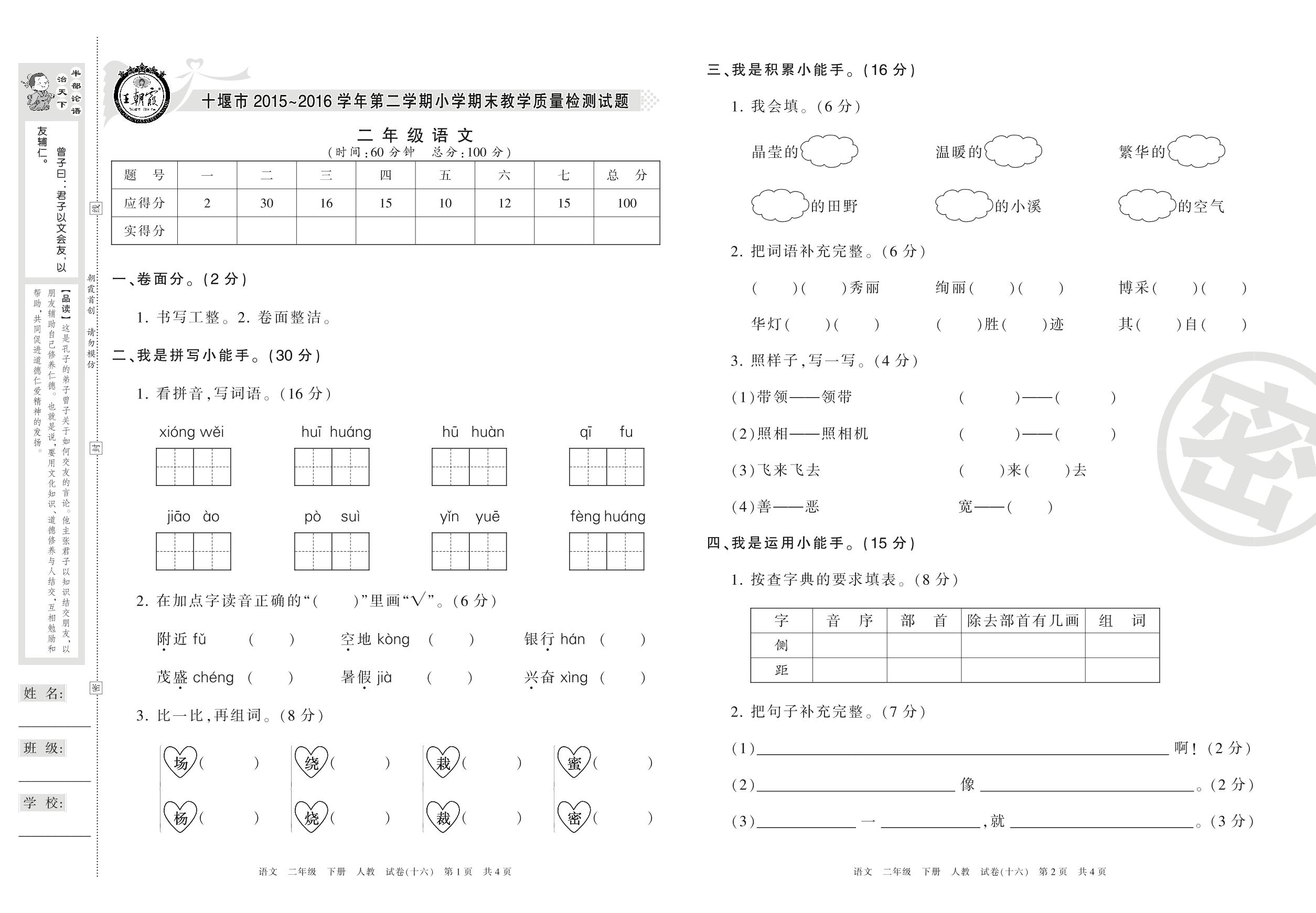 2015-2016学年第二学期十堰市二年级语文试卷(人教版)【16】