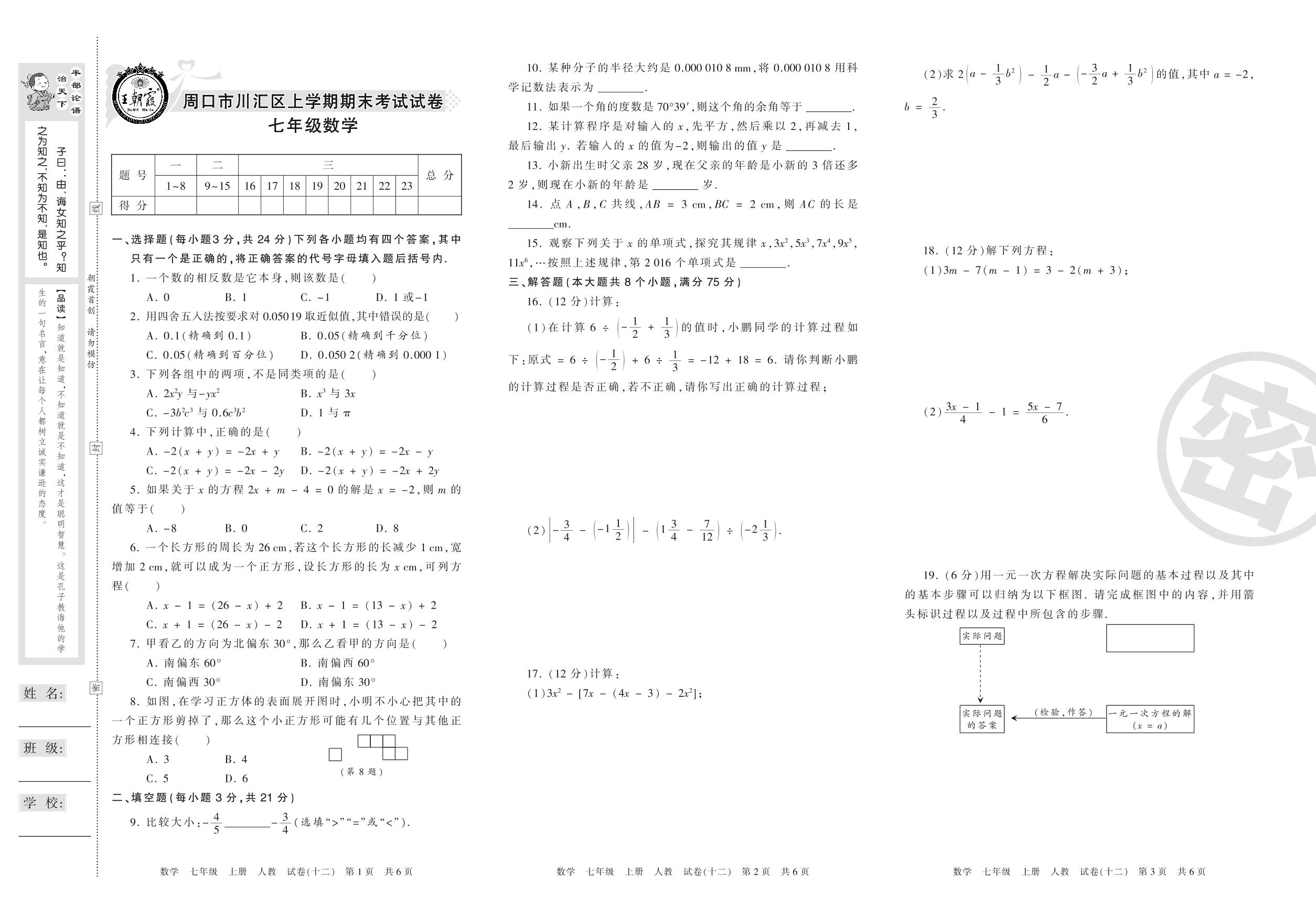 2016-2017学年第一学期周口市川汇区七年级数学试卷(人教版)【12】