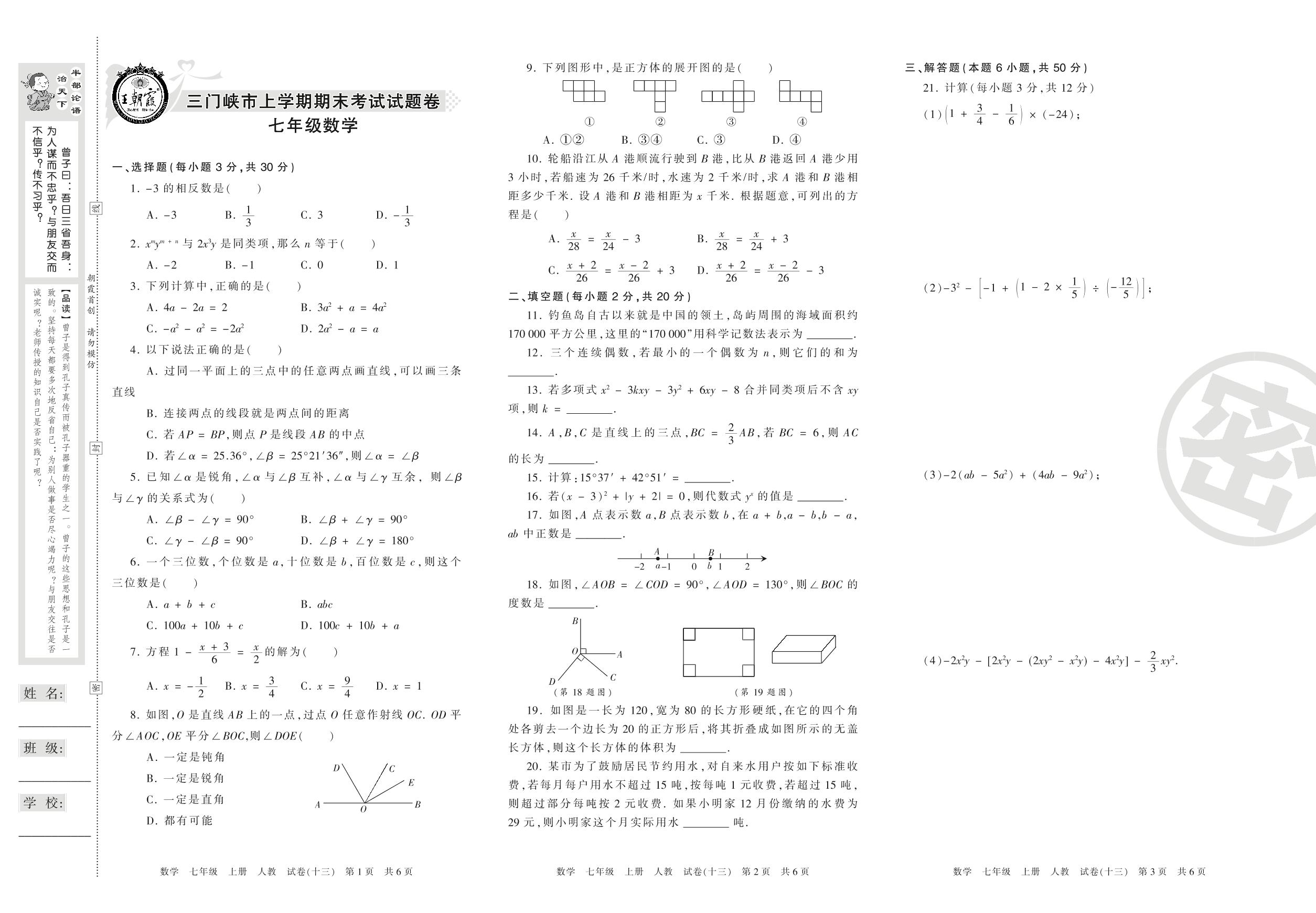 2016-2017学年第一学期三门峡市七年级数学试卷(人教版)【13】