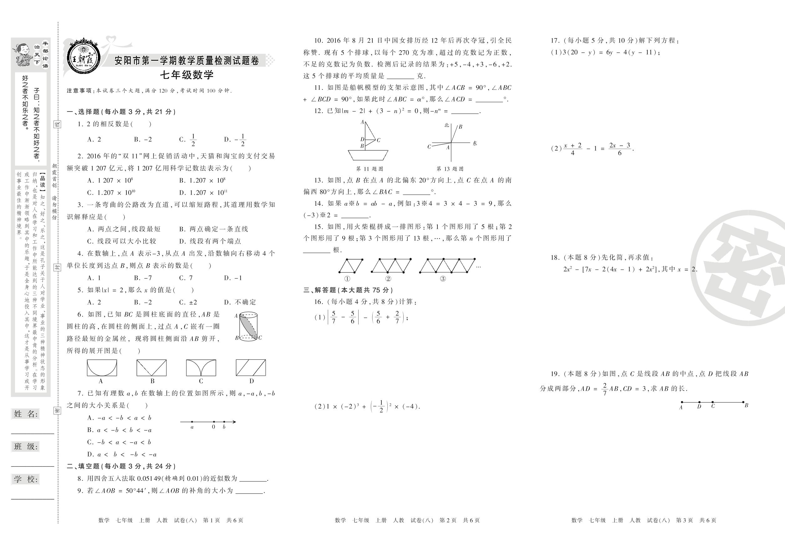 2016-2017学年第一学期安阳市七年级数学试卷(人教版)【8】
