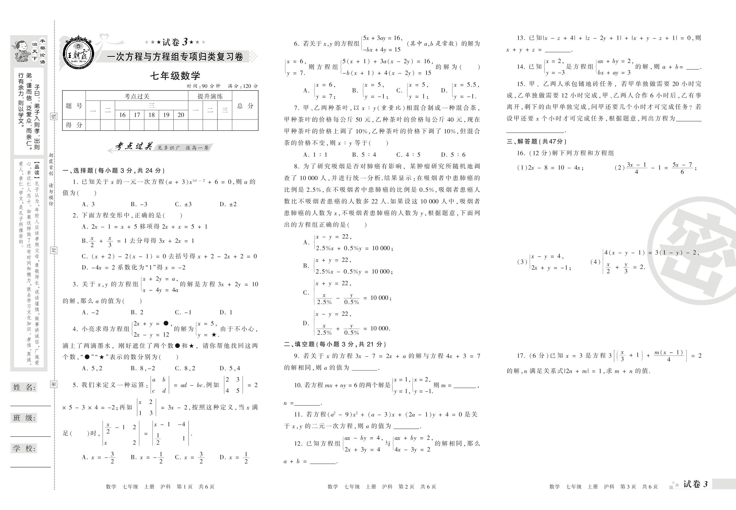 王朝霞期末专项卷七年级上册数学(沪科版)【3】