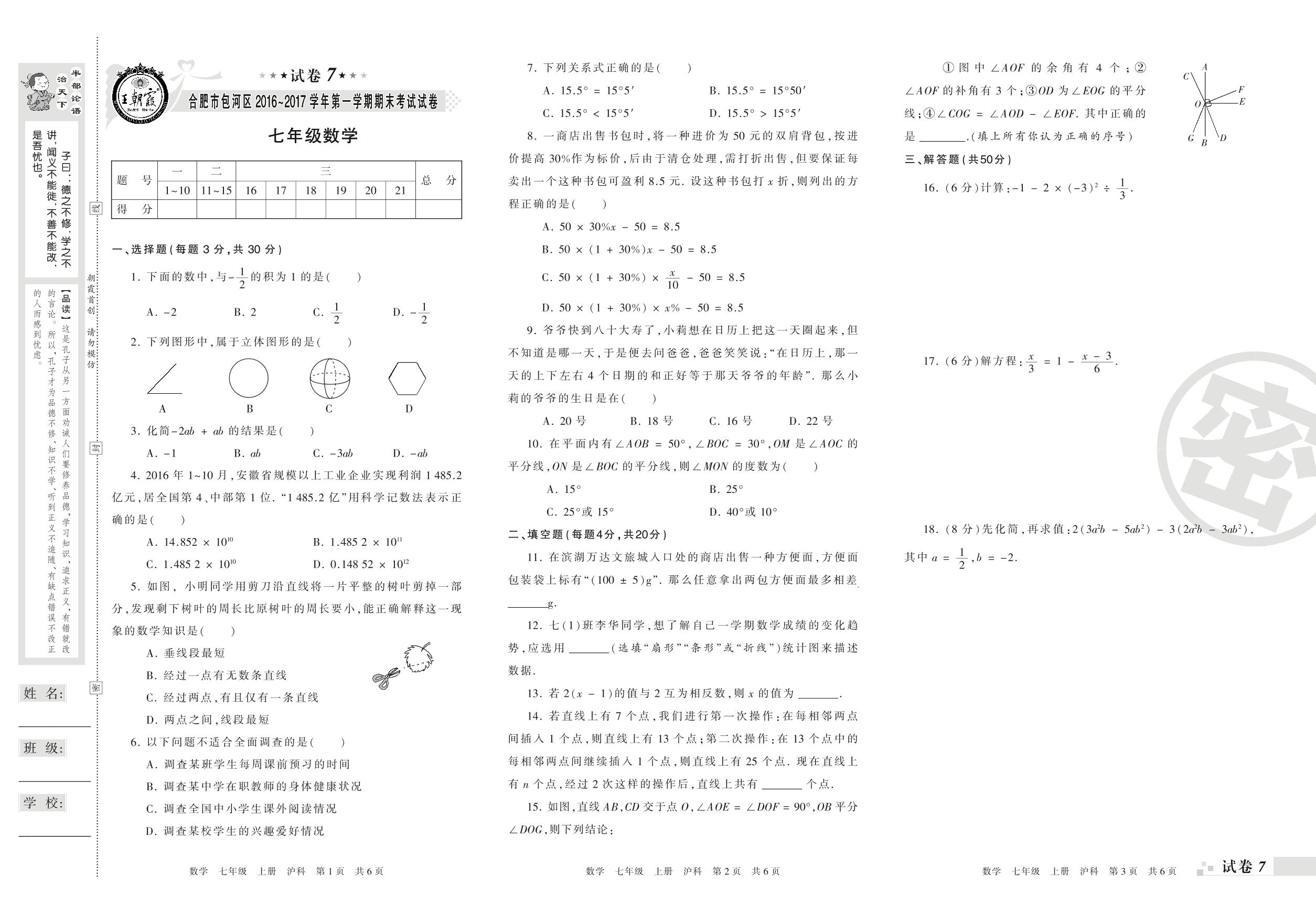 2016-2017学年第一学期合肥市包河区七年级数学试卷(沪科版)【7】