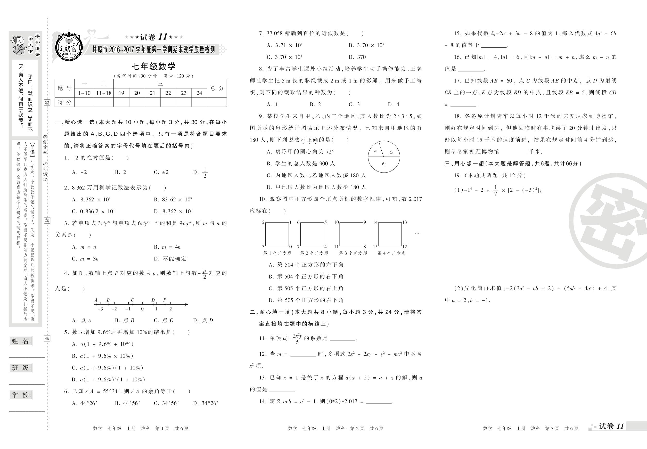 2016-2017学年第一学期蚌埠市七年级数学试卷(沪科版)【11】