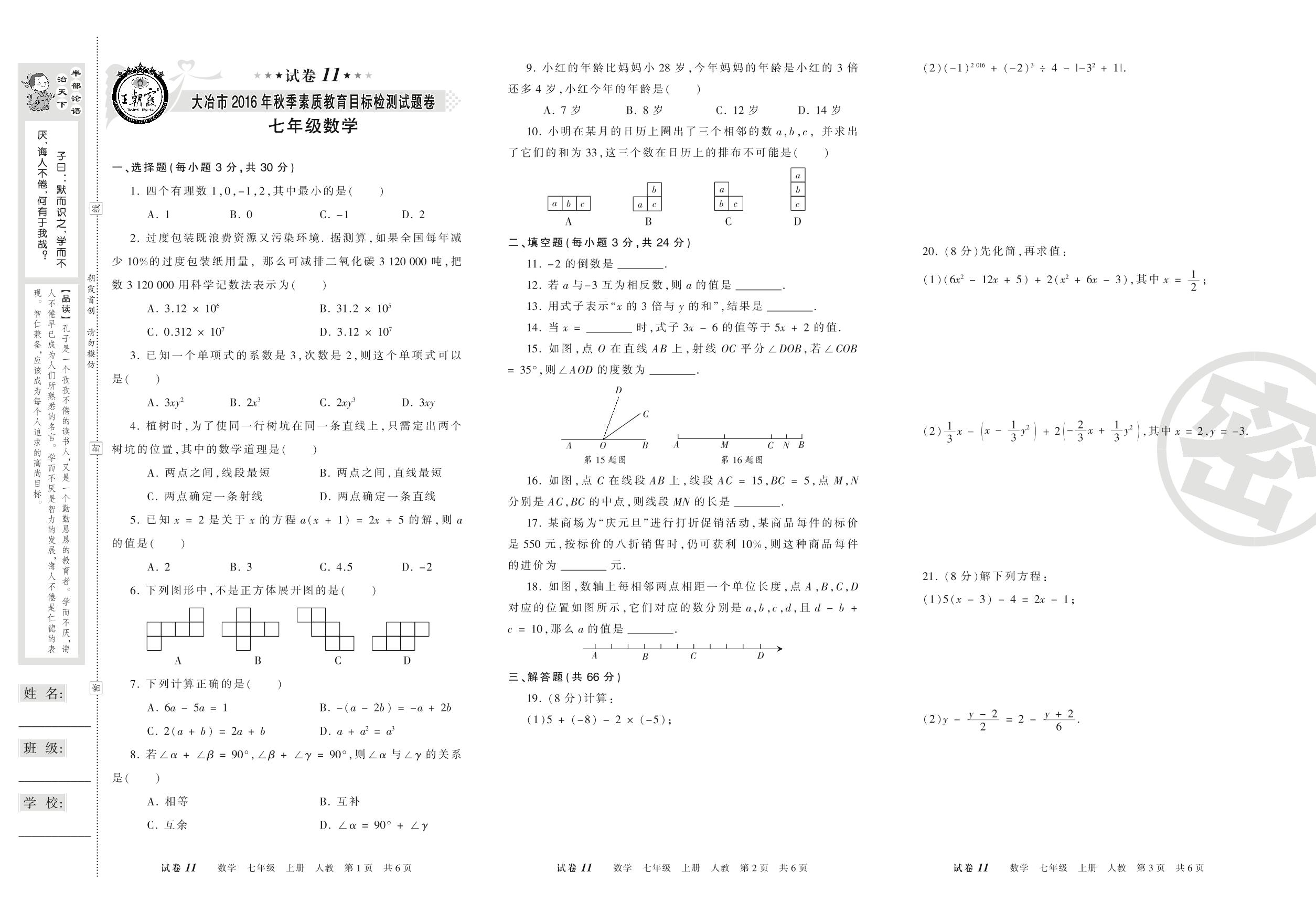 2016-2017学年第一学期大冶市七年级数学试卷(人教版)【11】