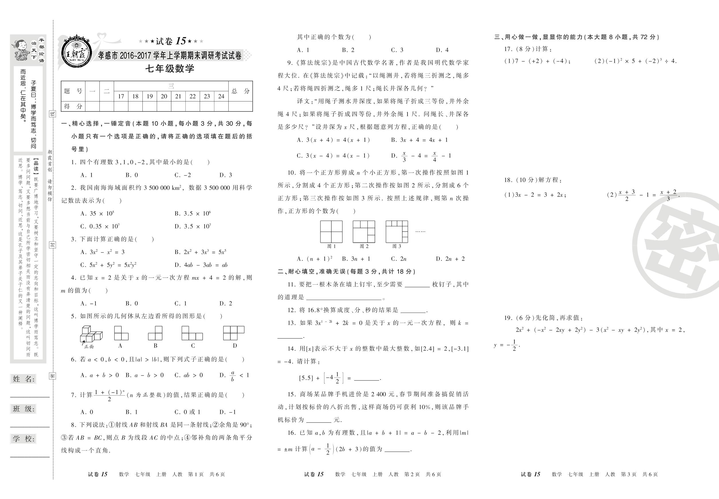 2016-2017学年第一学期孝感市七年级数学试卷(人教版)【15】