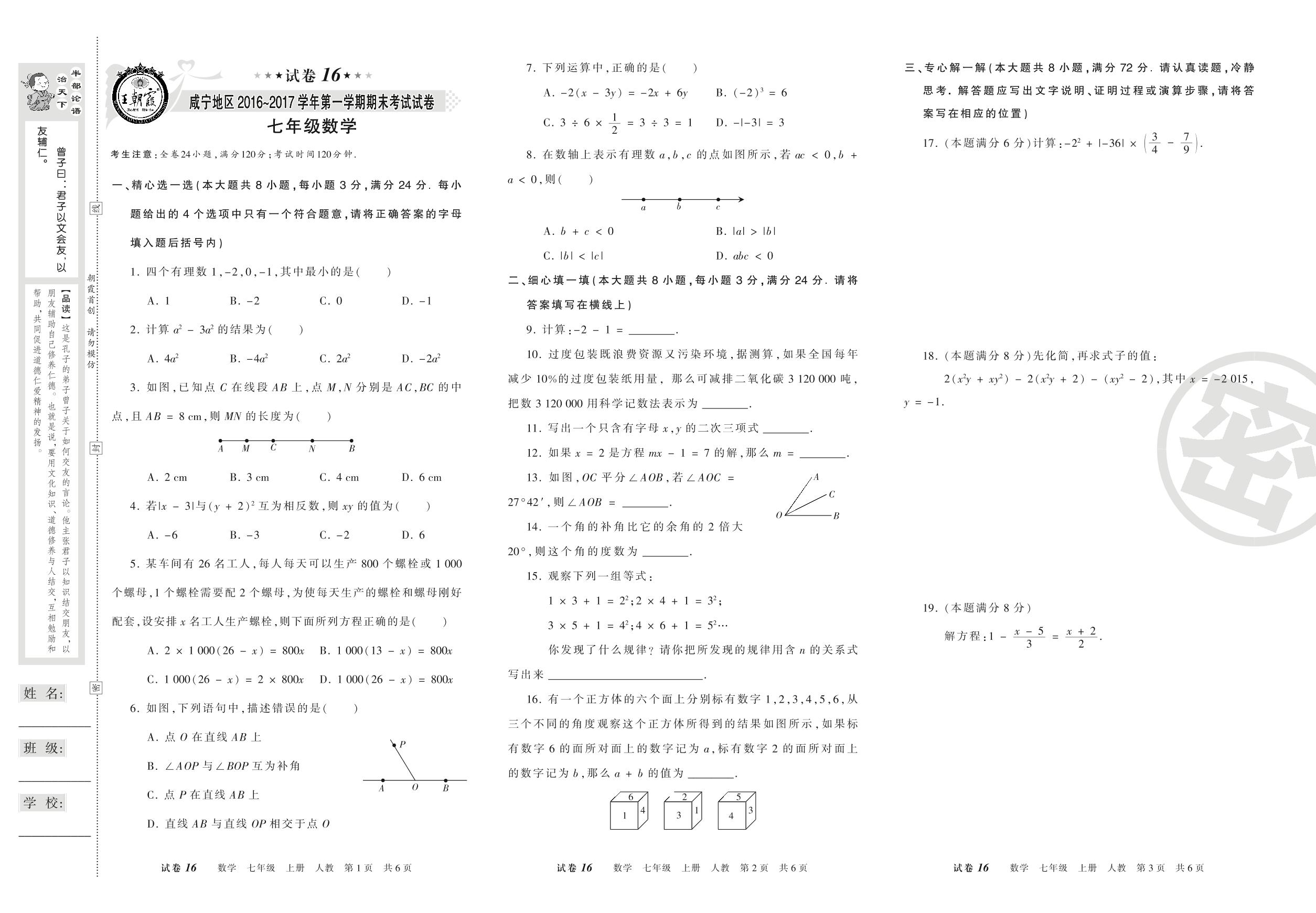 2016-2017学年第一学期咸宁市咸宁地区七年级数学试卷(人教版)【16】