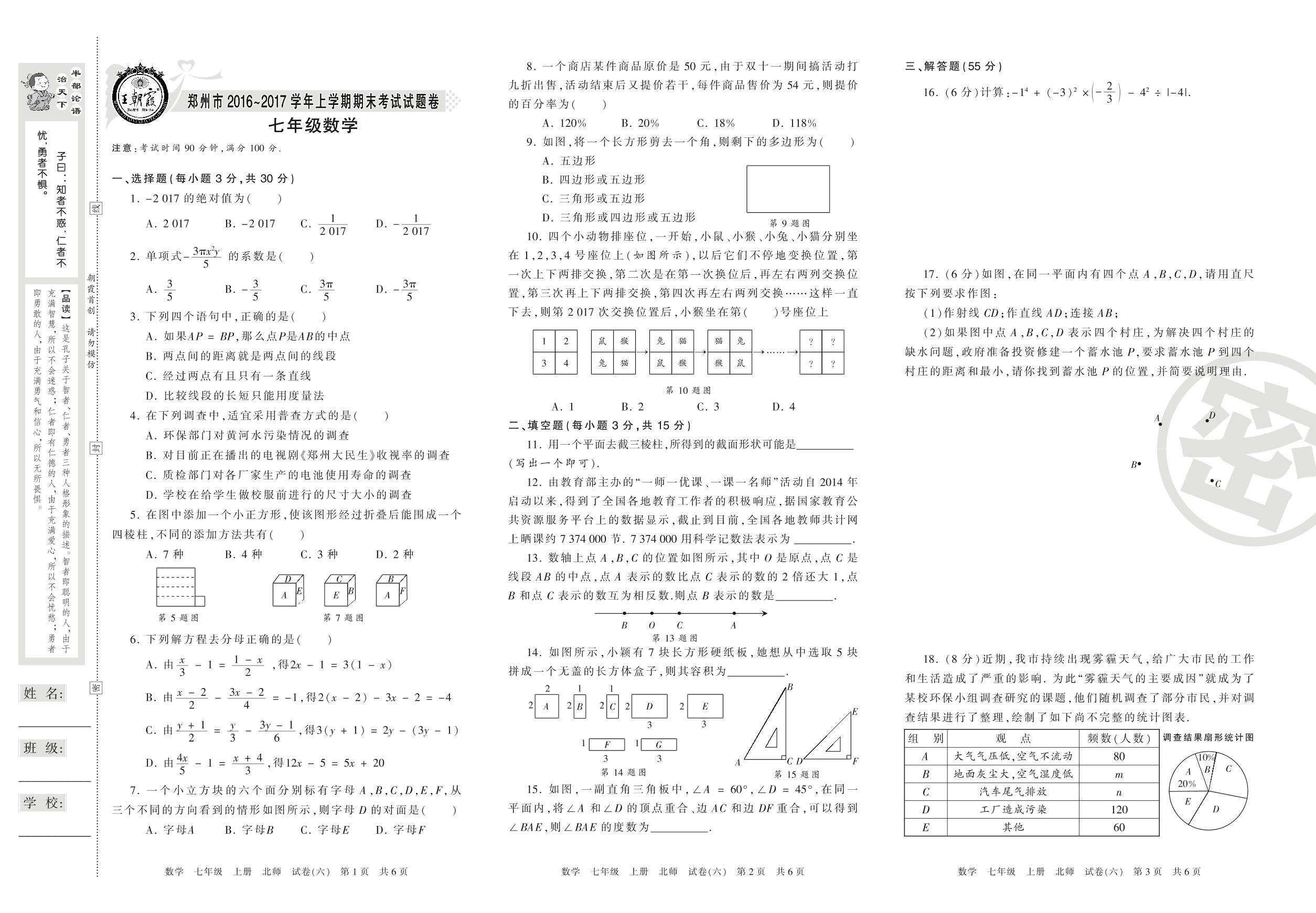 2016-2017学年第一学期郑州市七年级数学试卷(北师版)_R210805171708【6】