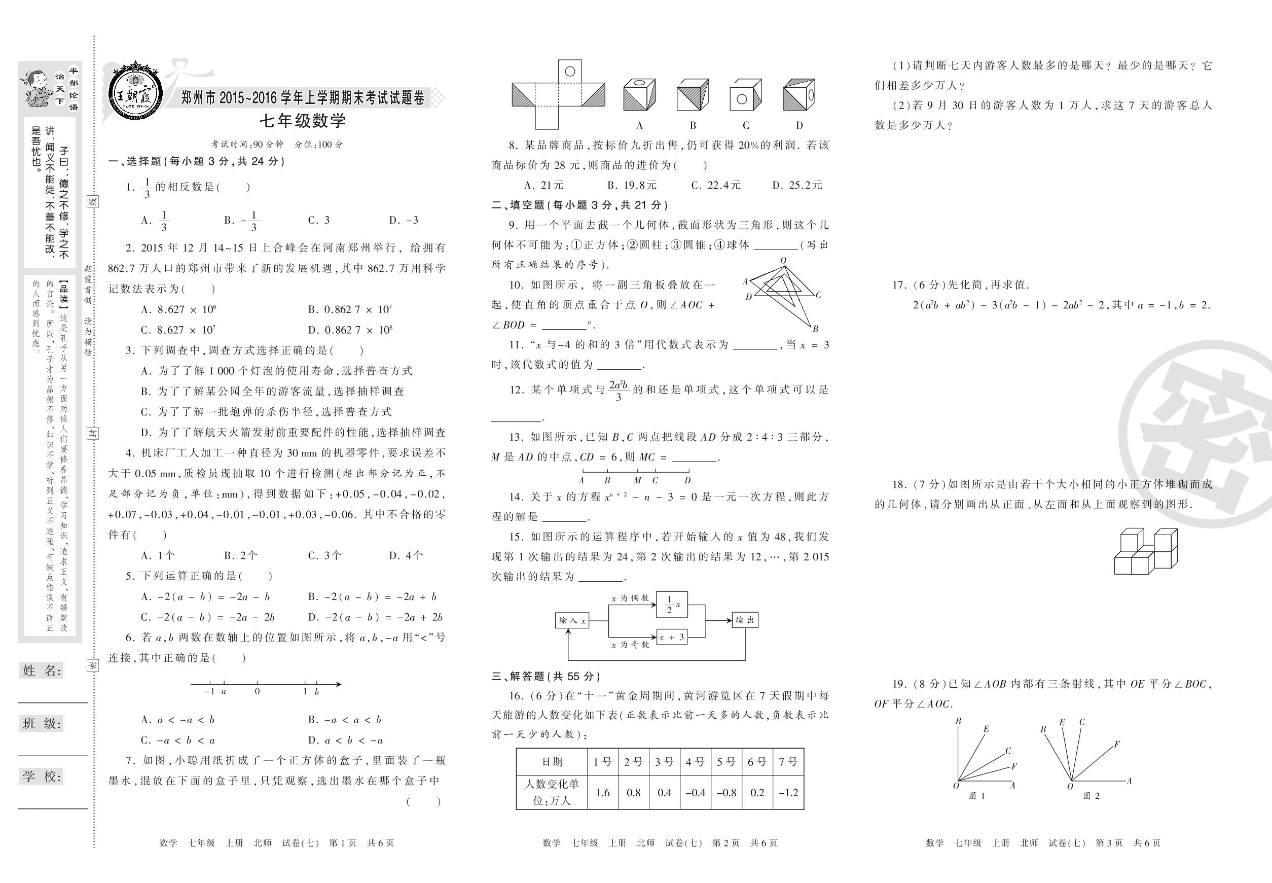 2015-2016学年第一学期郑州市七年级数学试卷(北师版)【7】