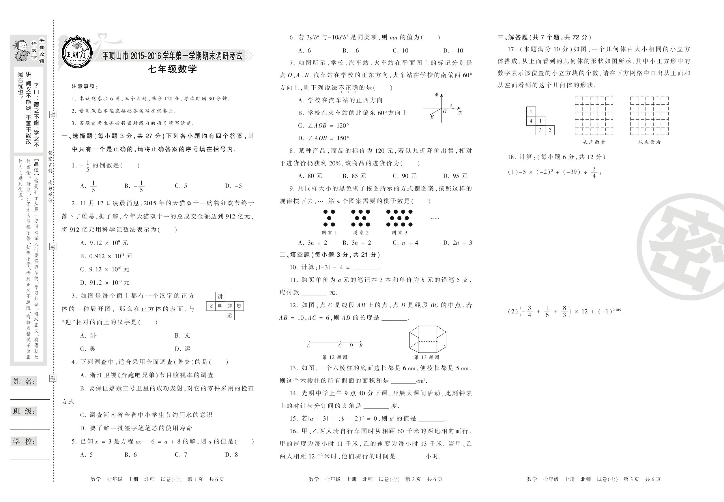 2015-2016学年第一学期平顶山市七年级数学试卷(北师版)【7】
