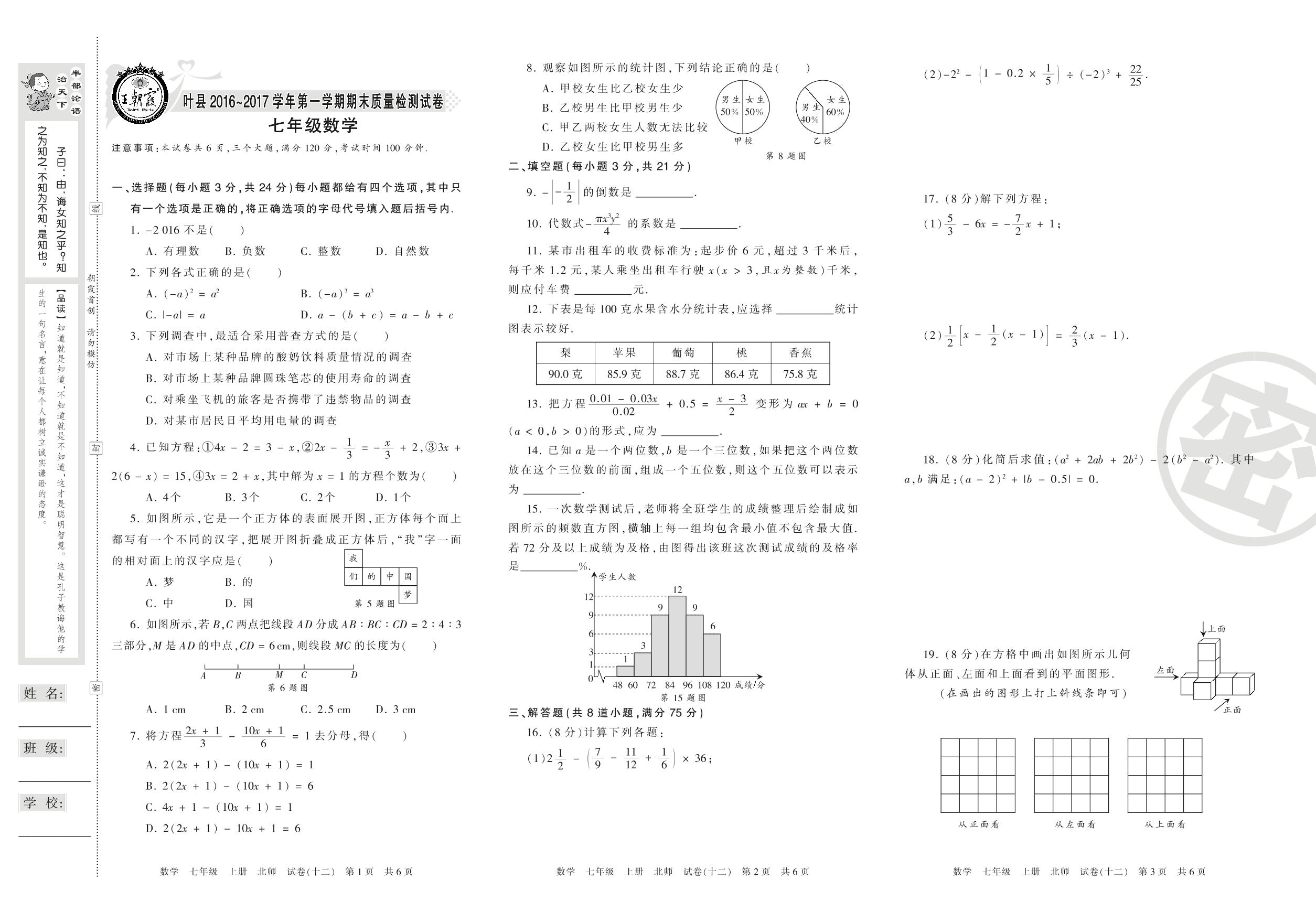 2016-2017学年第一学期平顶山市叶县七年级数学试卷(北师版)【12】