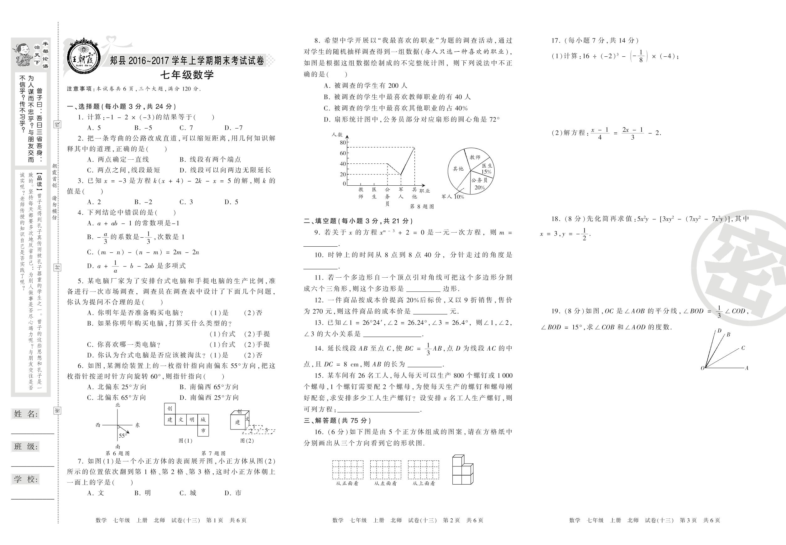 七年级数学北师版上册期末卷