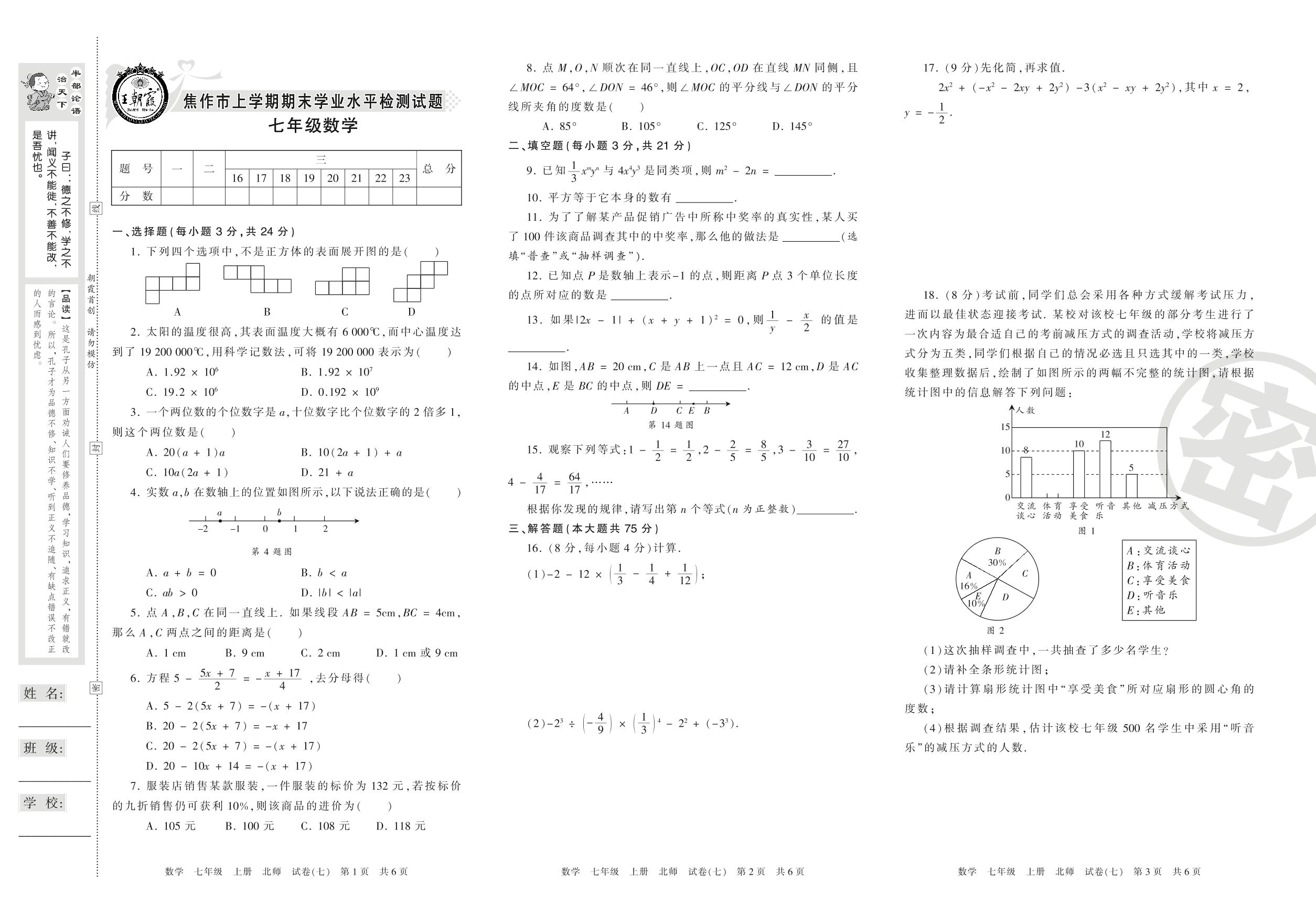 2016-2017学年第一学期焦作市七年级数学试卷(北师版)【7】