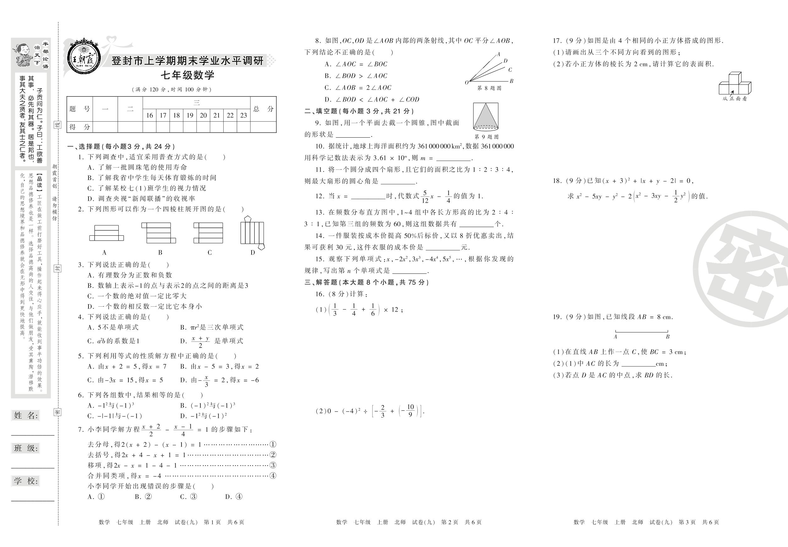 2016-2017学年第一学期登封市七年级数学试卷(北师版)_R210805172110【9】