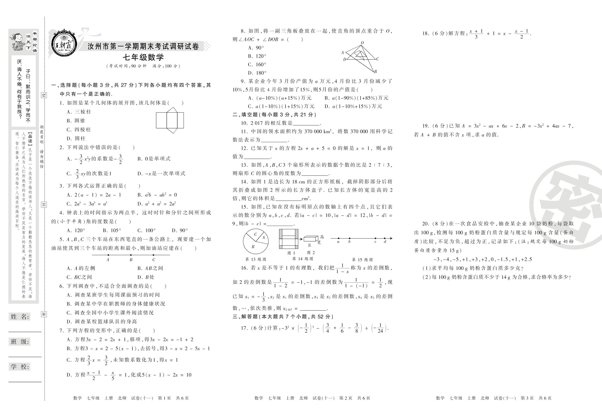 2016-2017学年第一学期汝州市七年级数学试卷(北师版)【11】