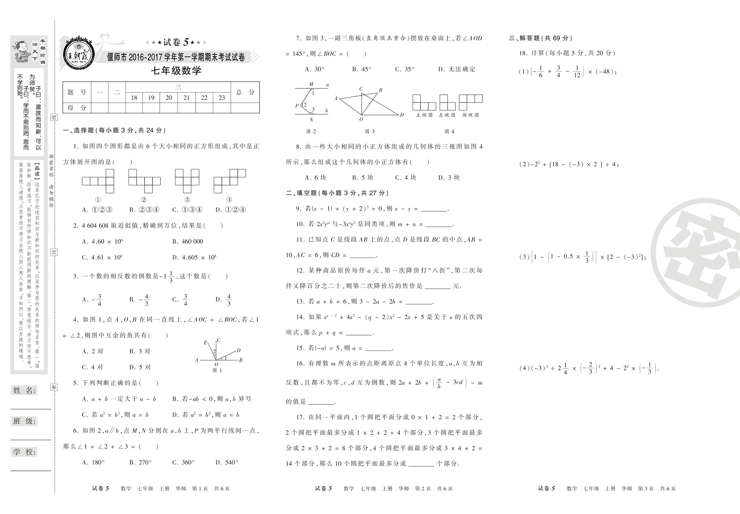 2016-2017学年第一学期偃师市七年级数学试卷(华师版)【5】