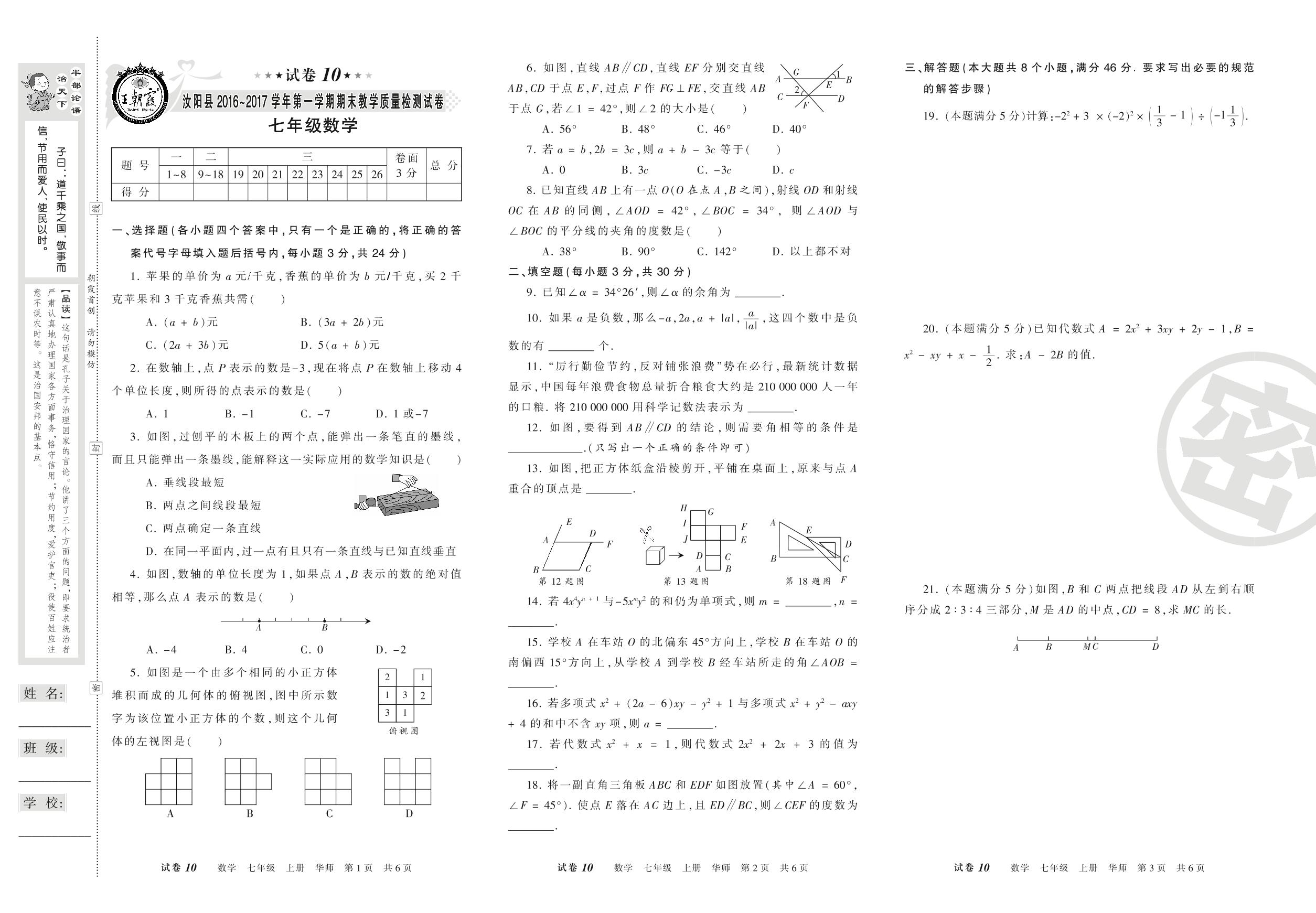 2016-2017学年第一学期洛阳市汝阳县七年级数学试卷(华师版)【10】