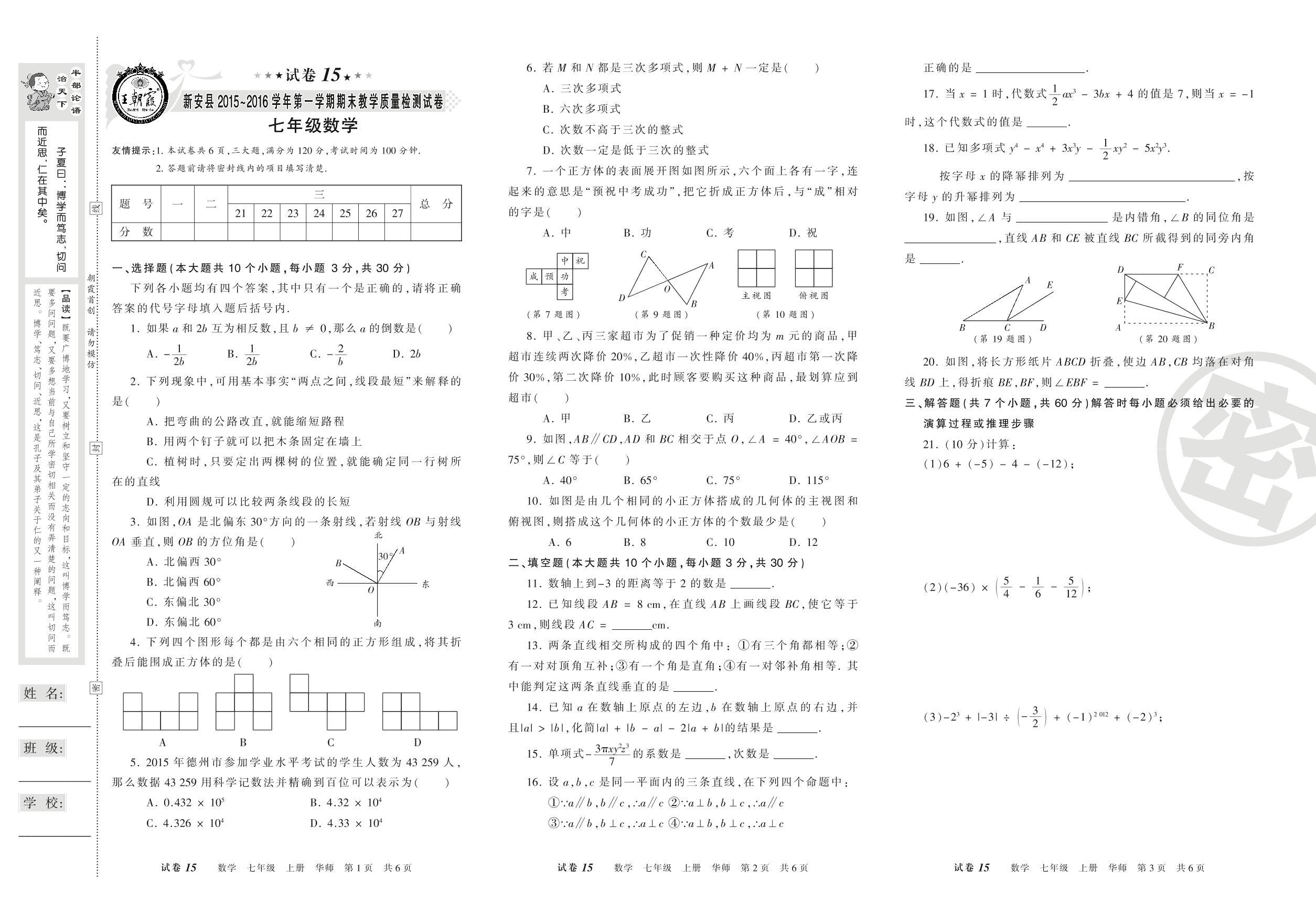 2015-2016学年第一学期洛阳市新安县七年级数学试卷(华师版)【15】