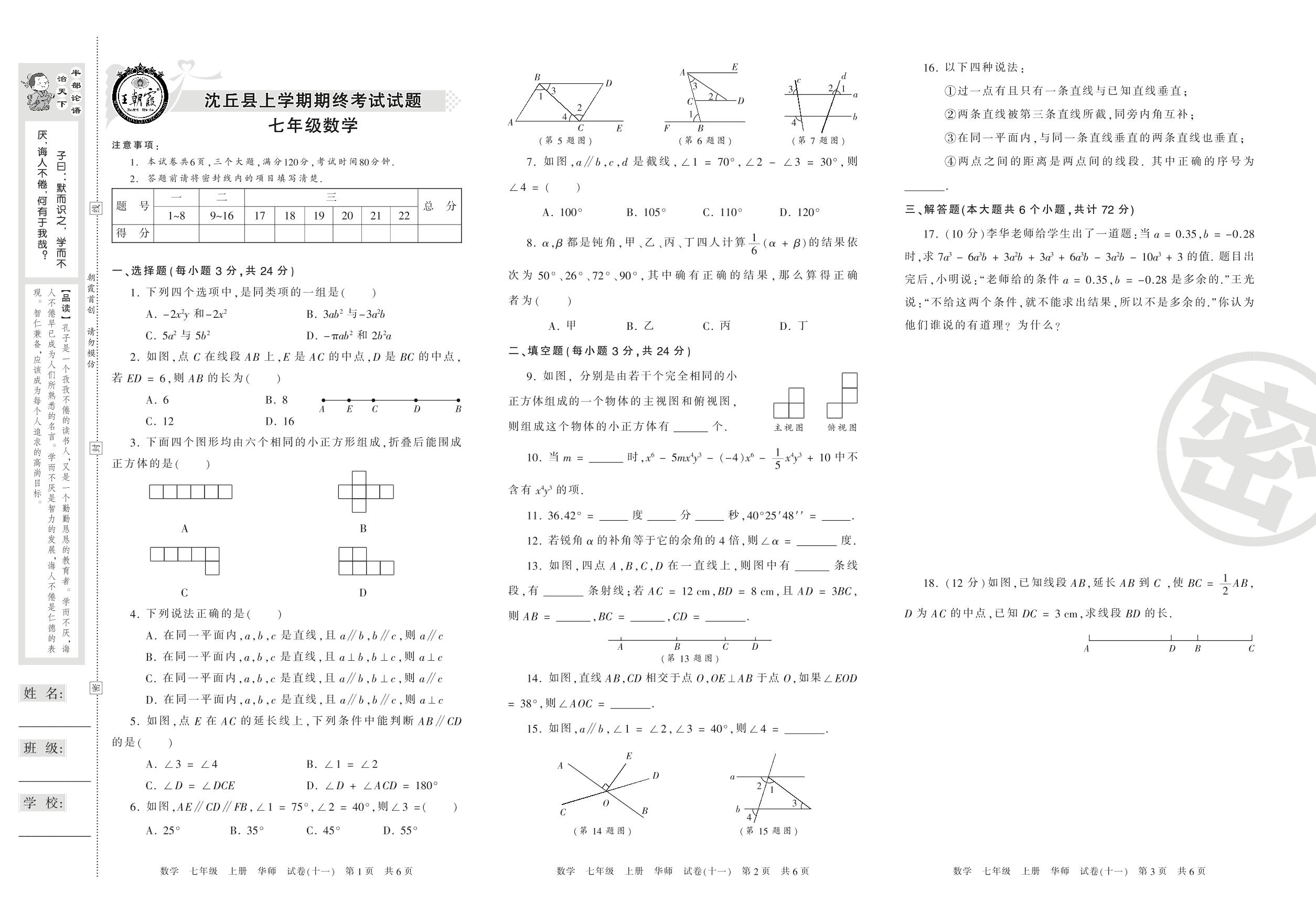 2016-2017学年第一学期周口市沈且县七年级数学试卷(华师版)【11】