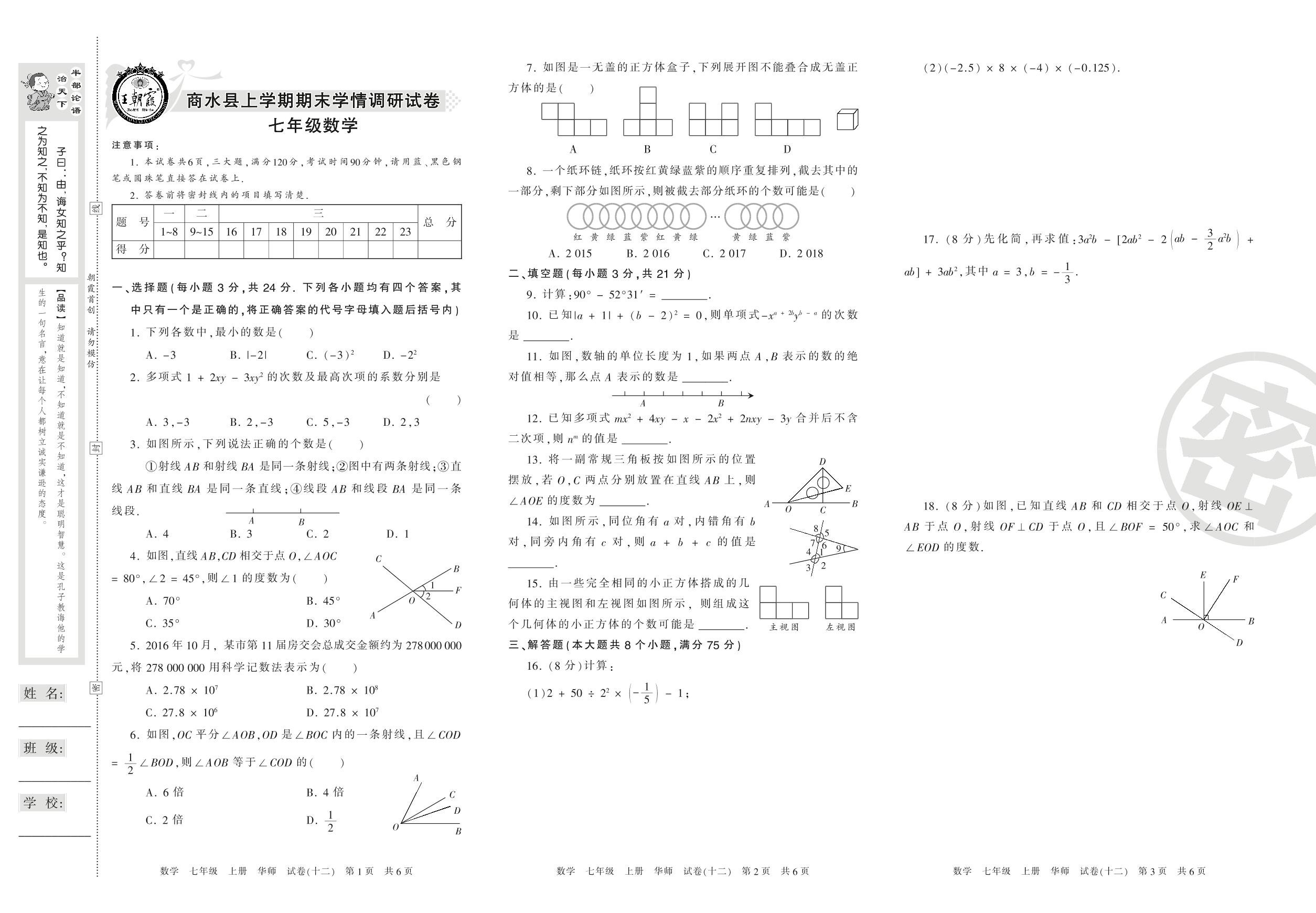 2016-2017学年第一学期周口市商水县七年级数学试卷(华师版)【12】