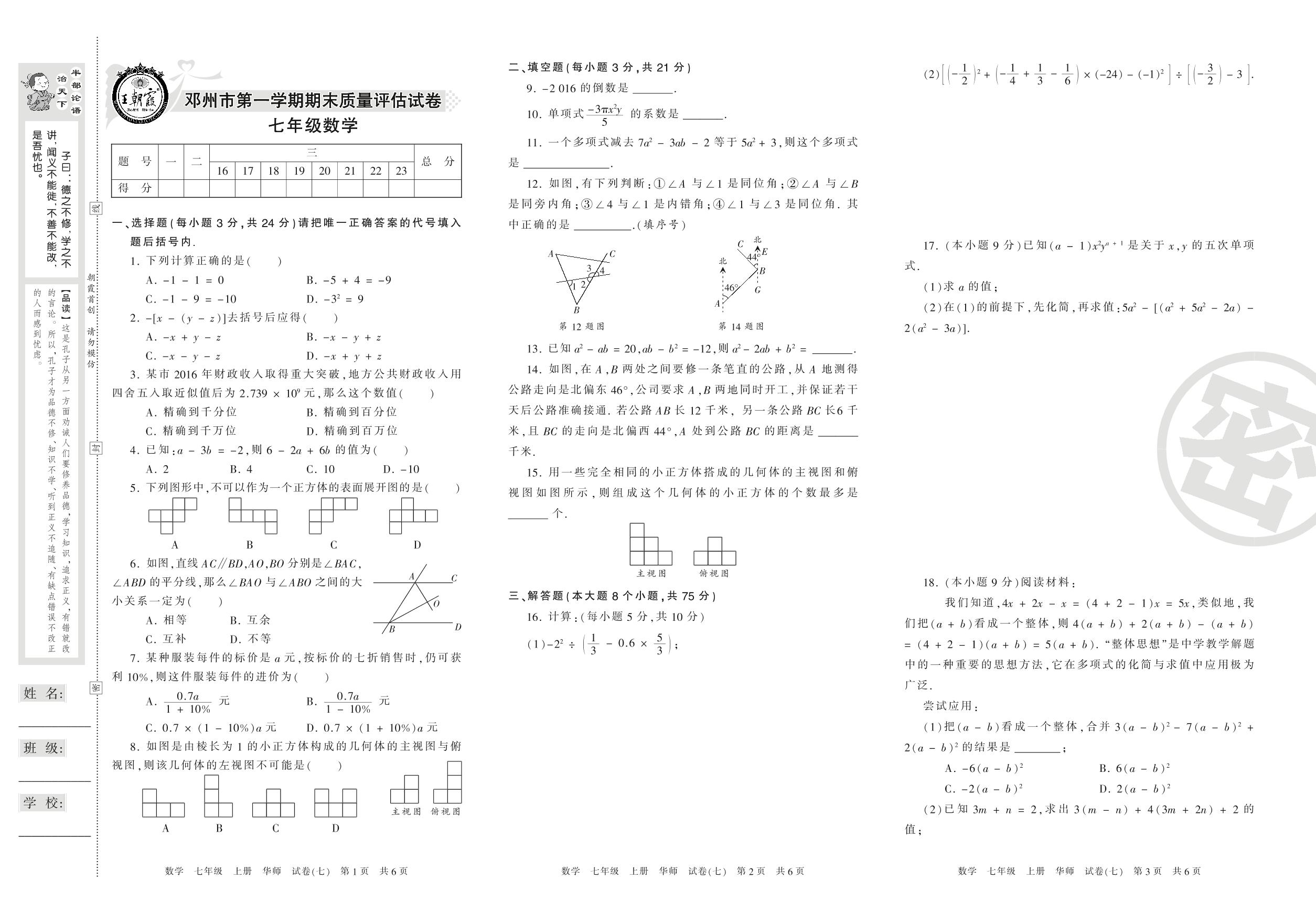 2016-2017学年第一学期邓州市七年级数学试卷(华师版)【7】