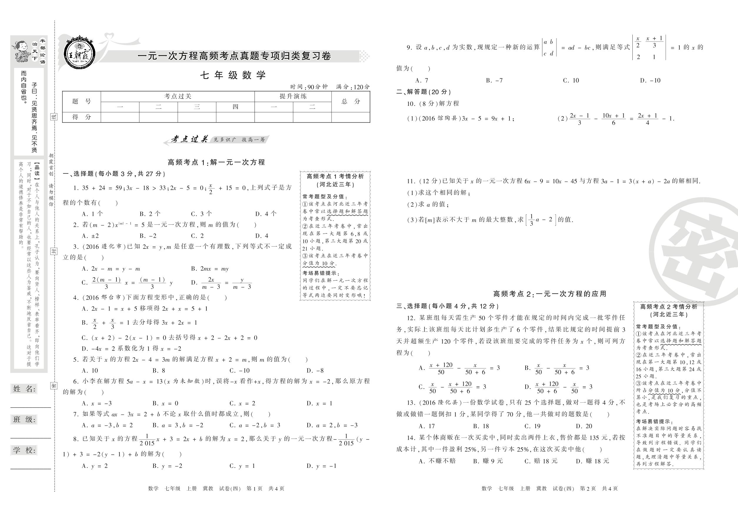 王朝霞期末专项卷七年级上册数学(冀教版)【4】