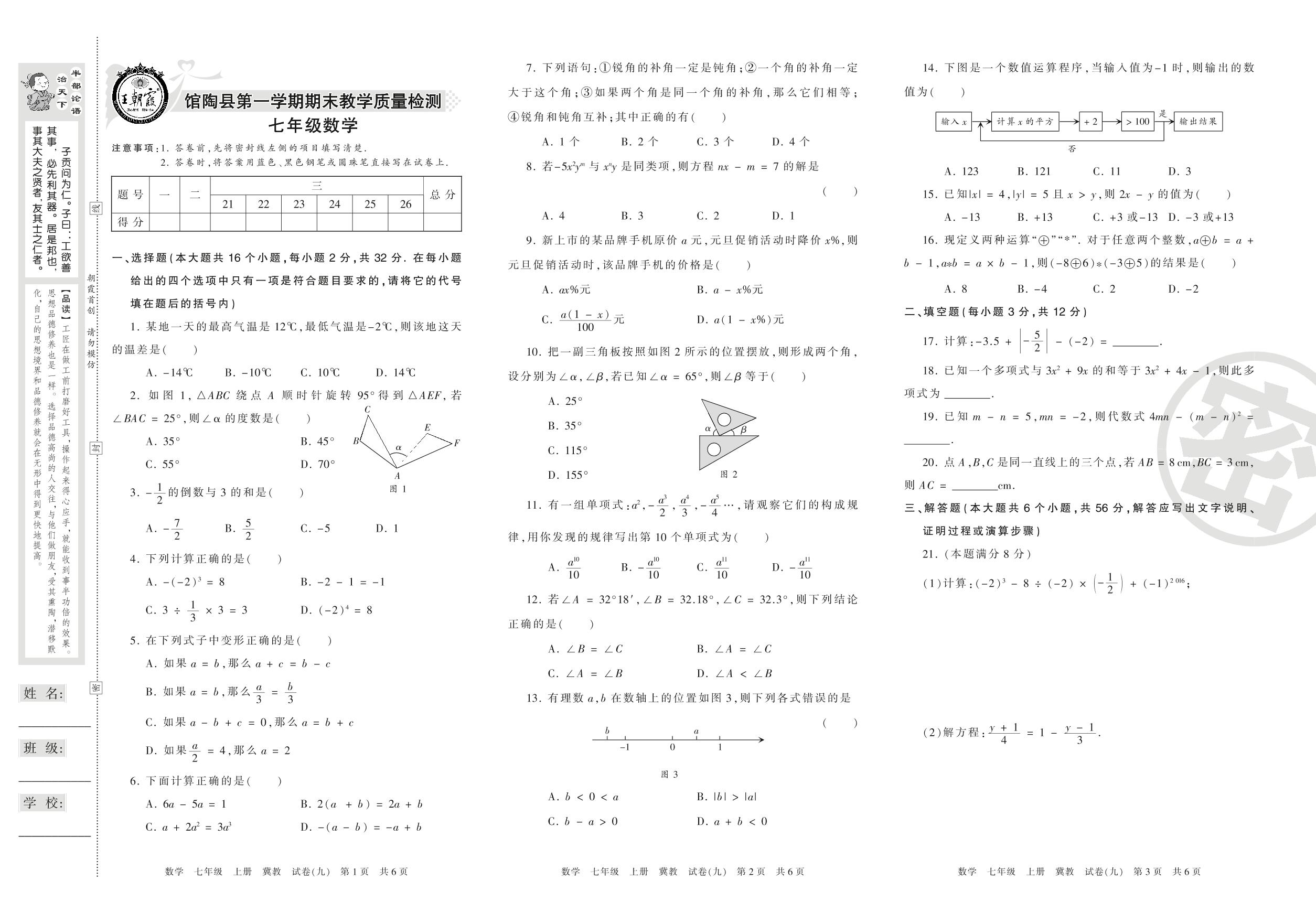 2016-2017学年第一学期邯郸市馆陶县七年级数学试卷(冀教版)【9】