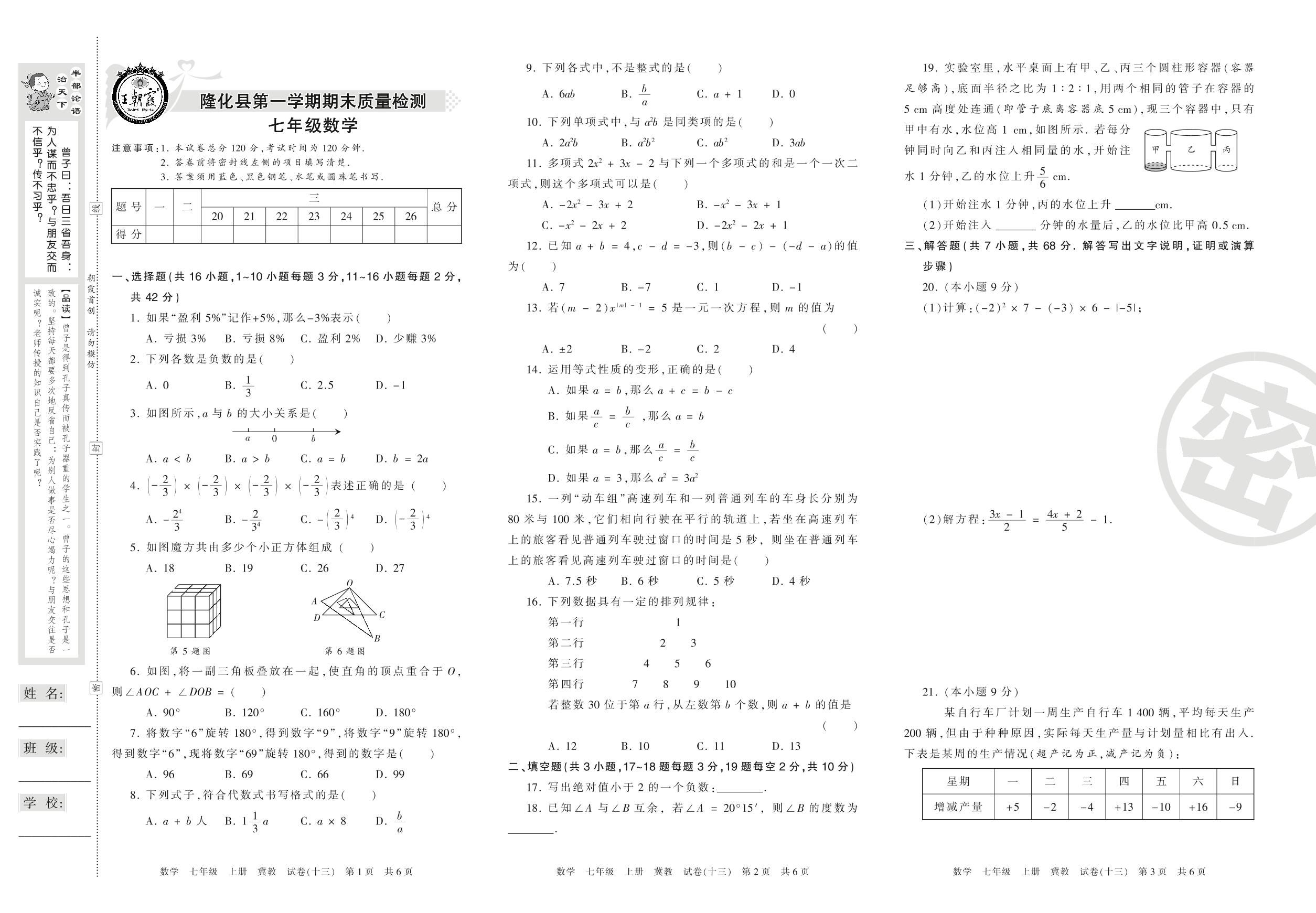 2016-2017学年第一学期承德市隆化县七年级数学试卷(冀教版)【13】
