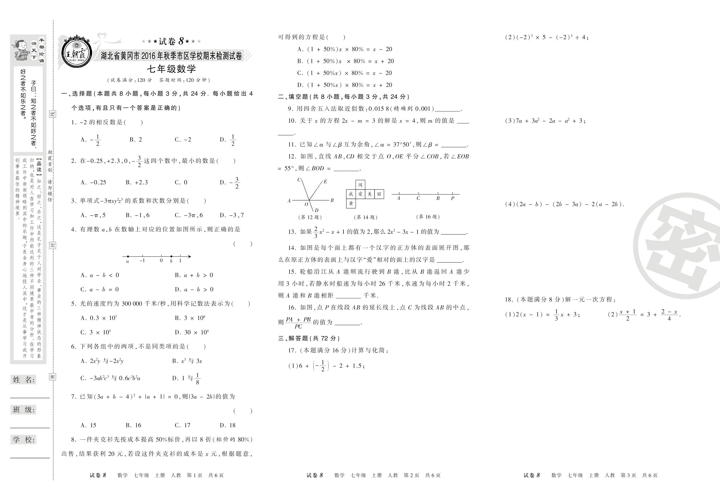 2016-2017学年第一学期湖北省黄冈市七年级数学试卷(人教版)【8】