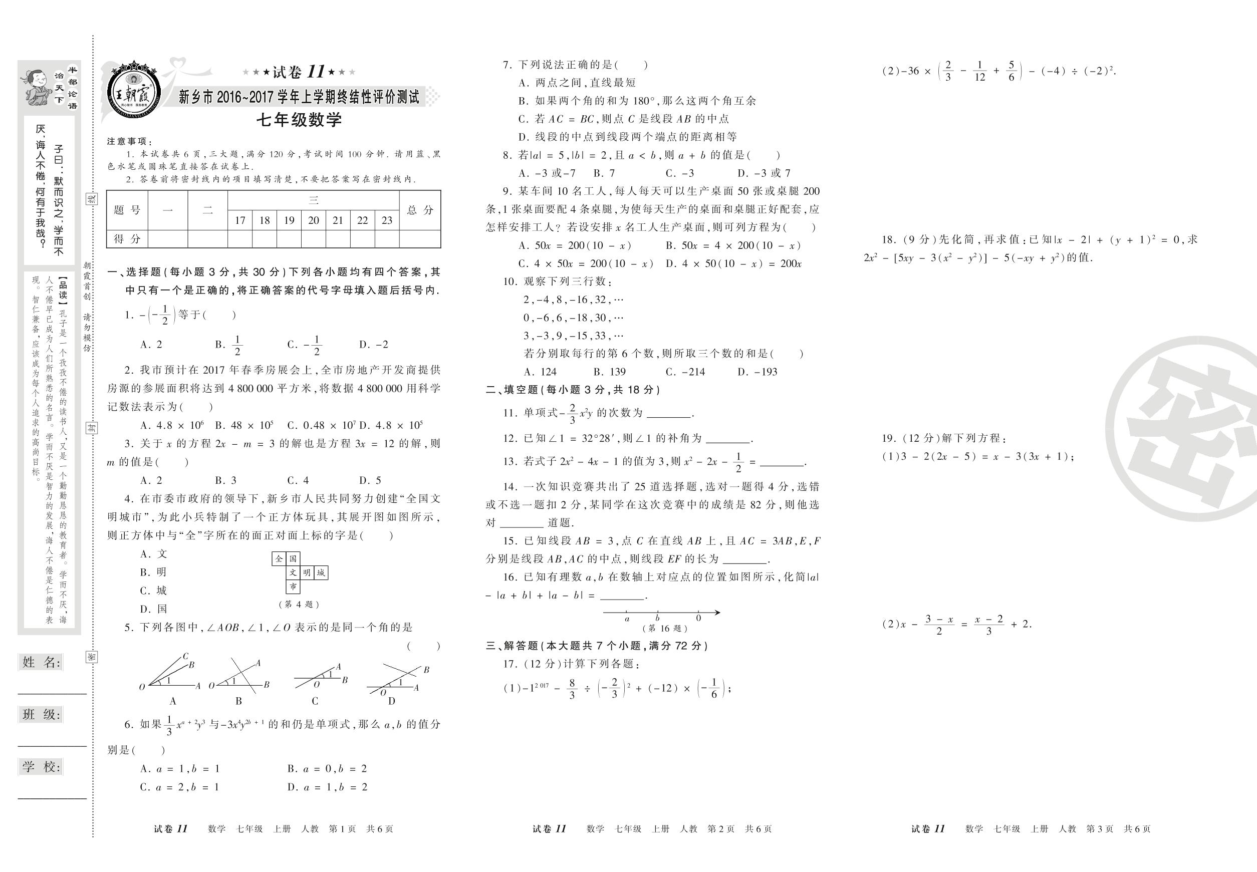 2016-2017学年第一学期新乡市七年级数学试卷(人教版)【11】