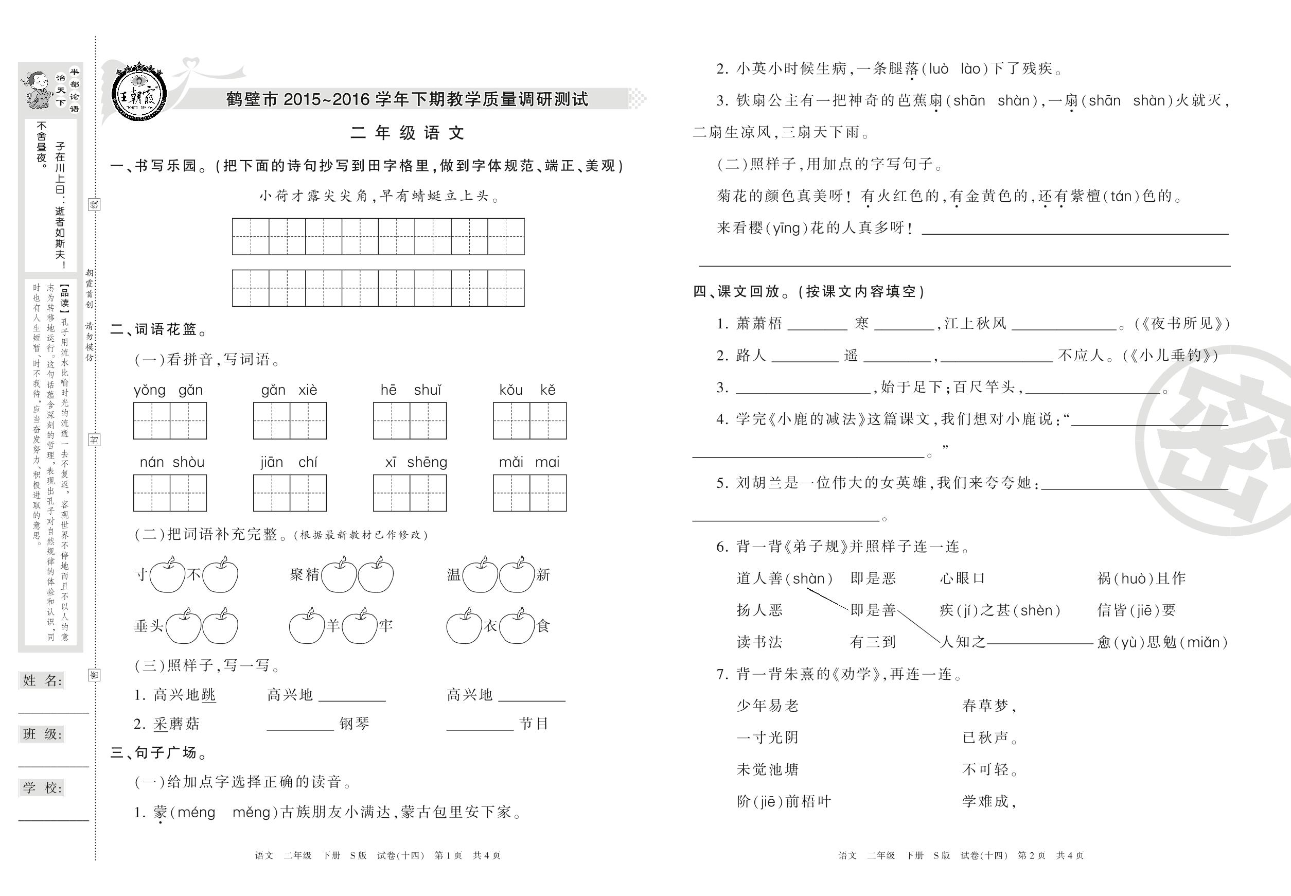 2015-2016学年第二学期鹤壁市二年级语文试卷(S版)【14】