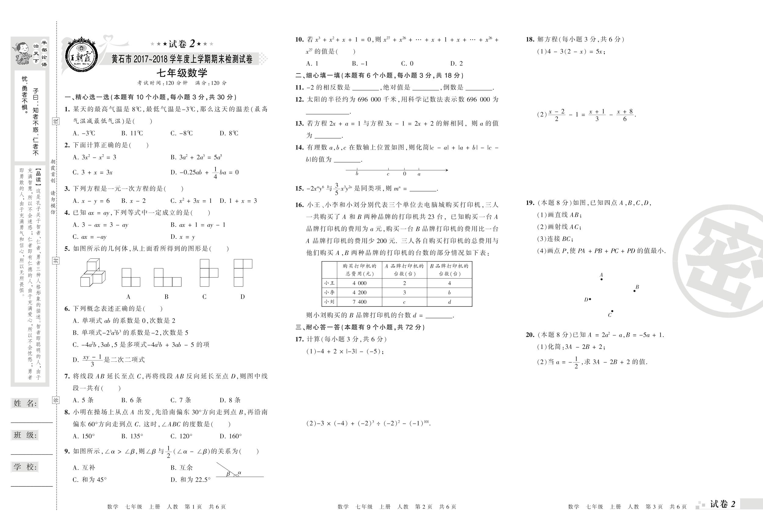 2017-2018学年第一学期黄石市七年级数学试卷(人教版)【2】