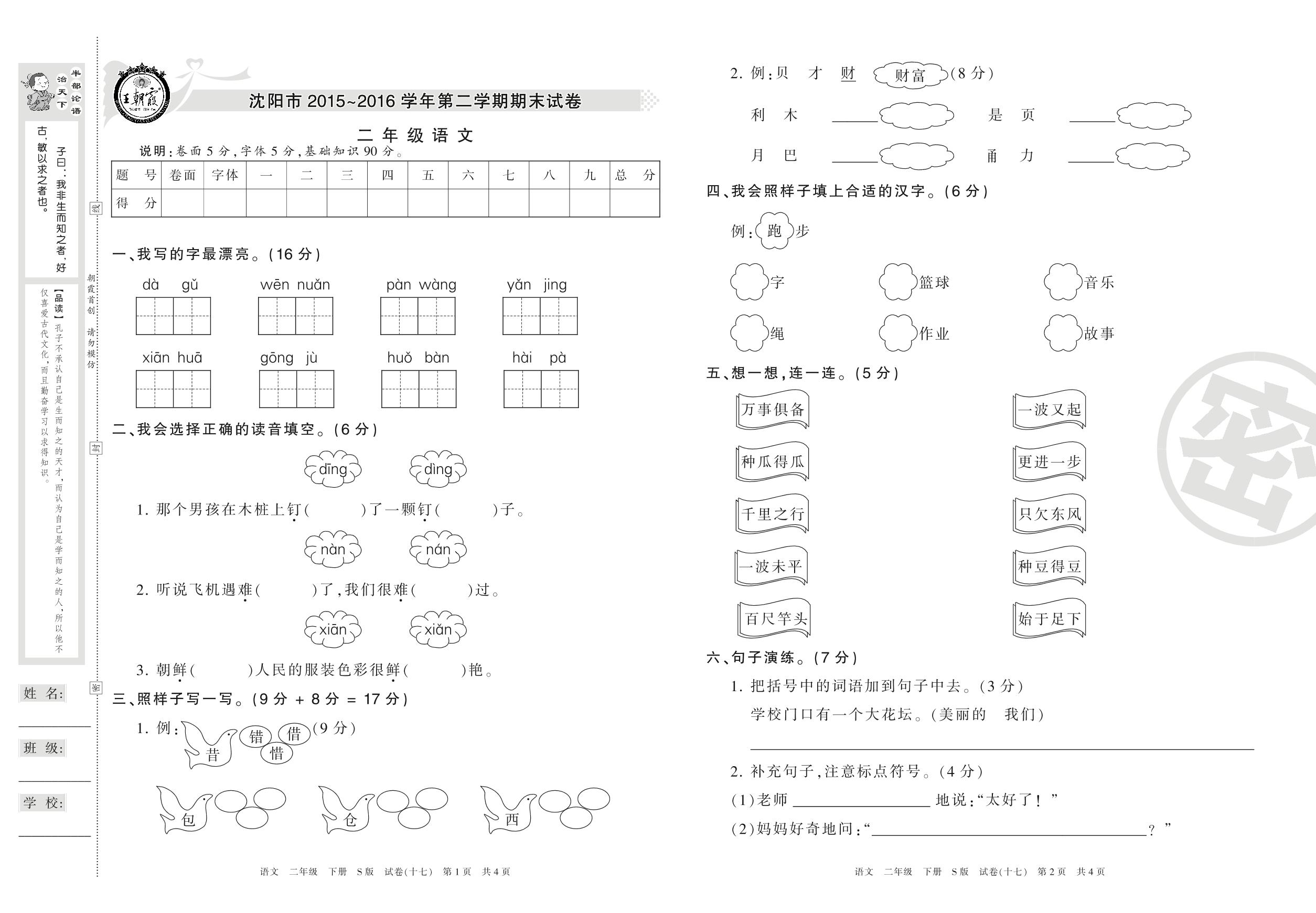 2015-2016学年第二学期沈阳市二年级语文试卷(S版)【17】