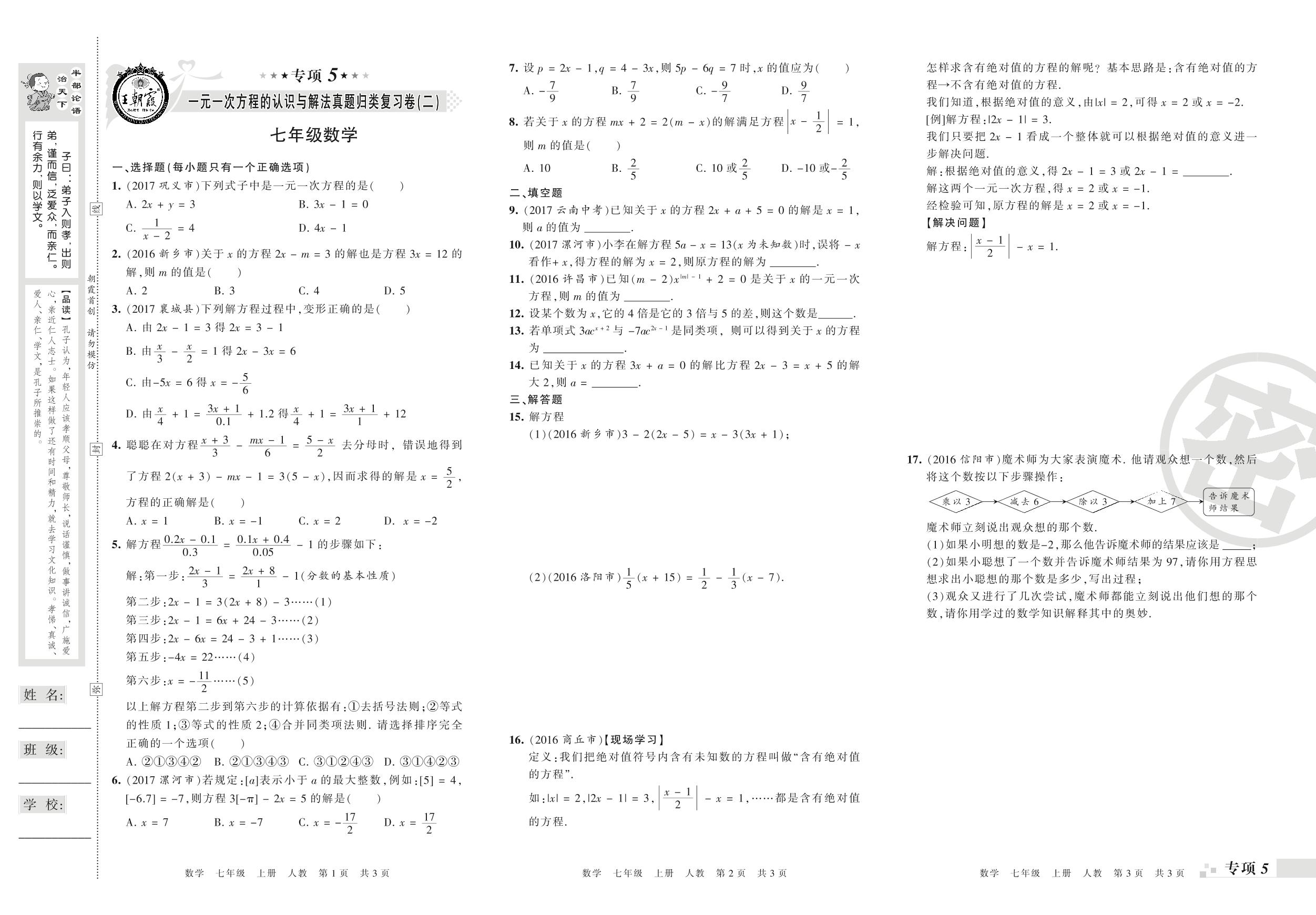 王朝霞期末专项卷——一元一次方程的认识与解法(二)、一元一次方程的应用真题归类复习卷七年级上册数学(人教版)_R210805175416【0】