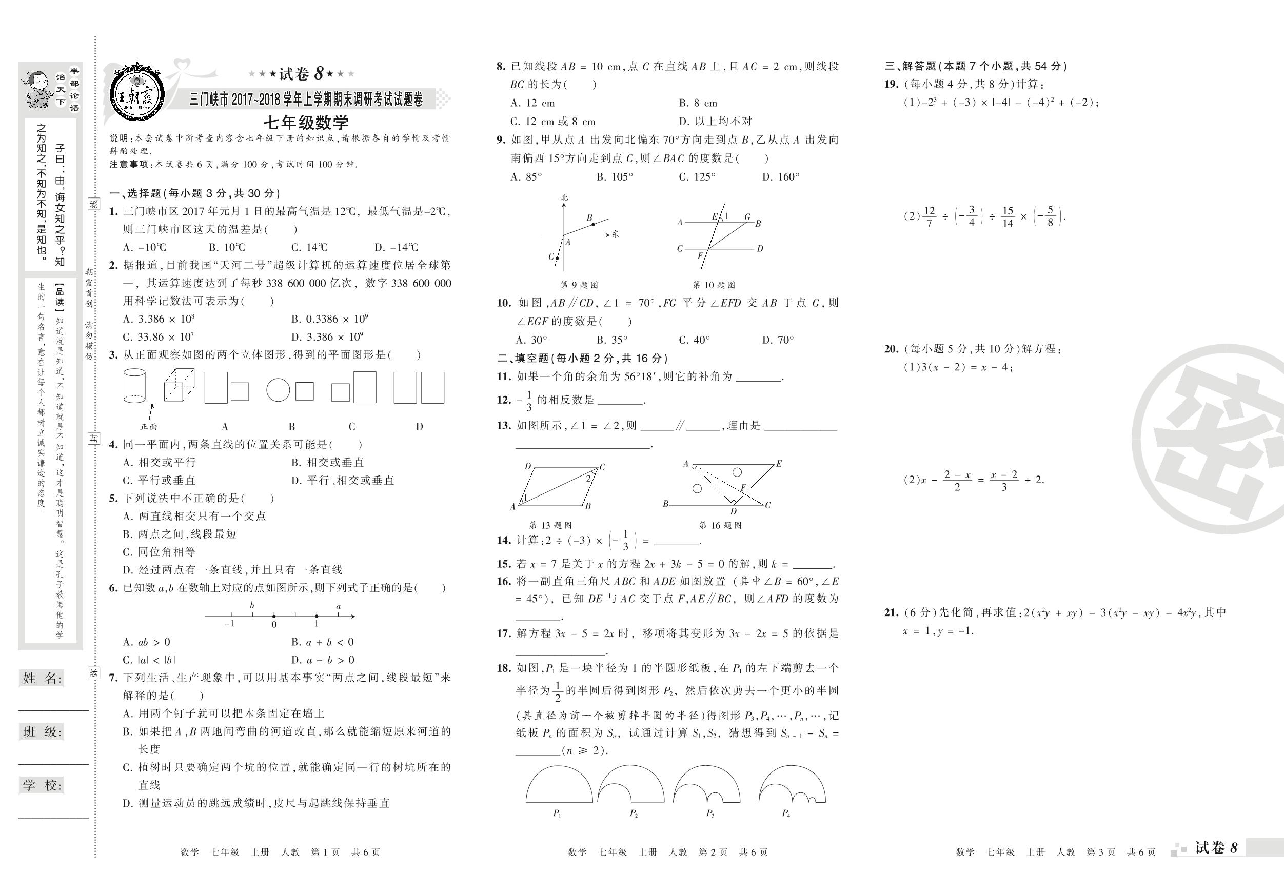 2017-2018学年第一学期三门峡市七年级数学试卷(人教版)【8】