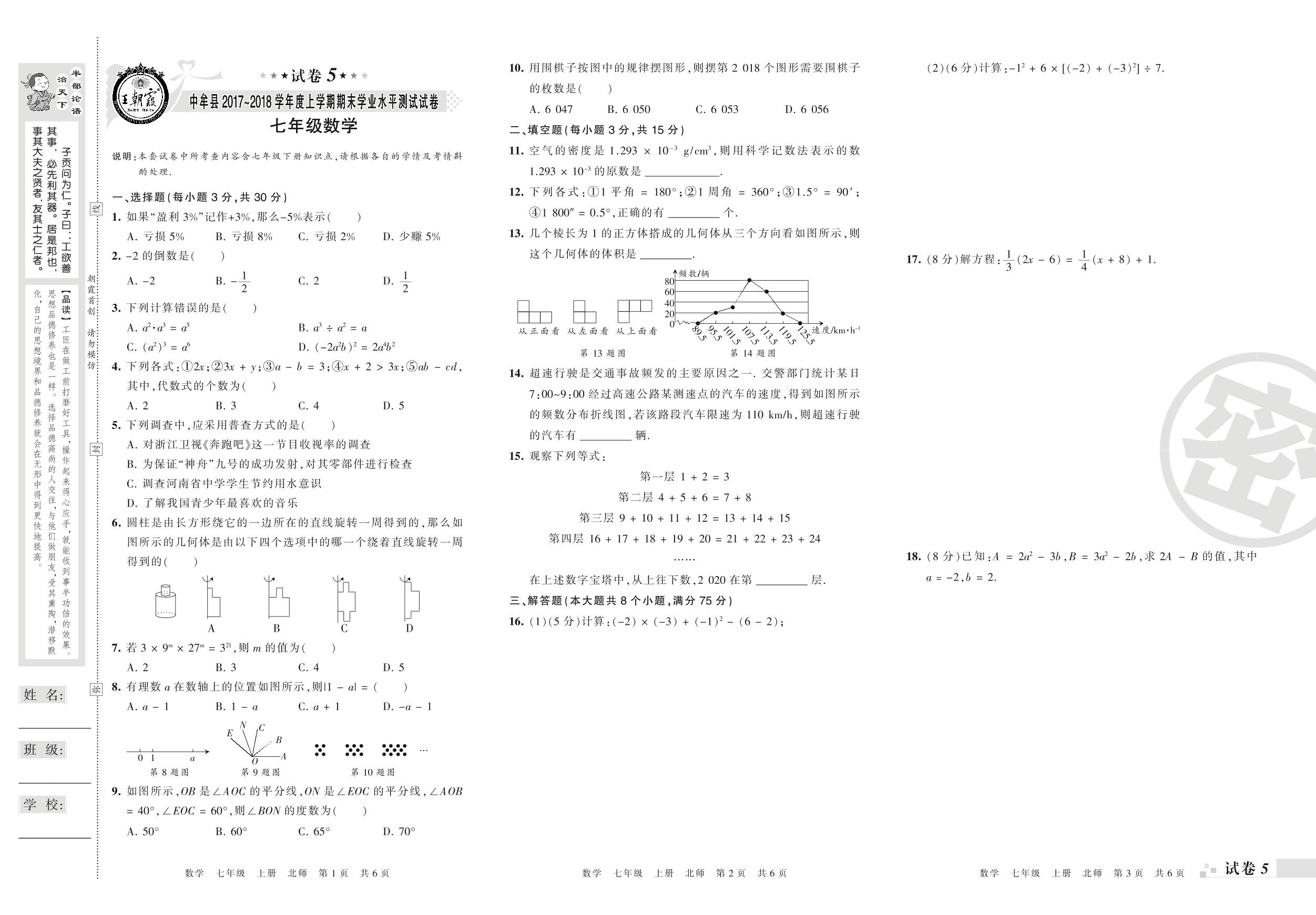 2017-2018学年第一学期郑州市中牟县七年级数学试卷(北师版)【5】