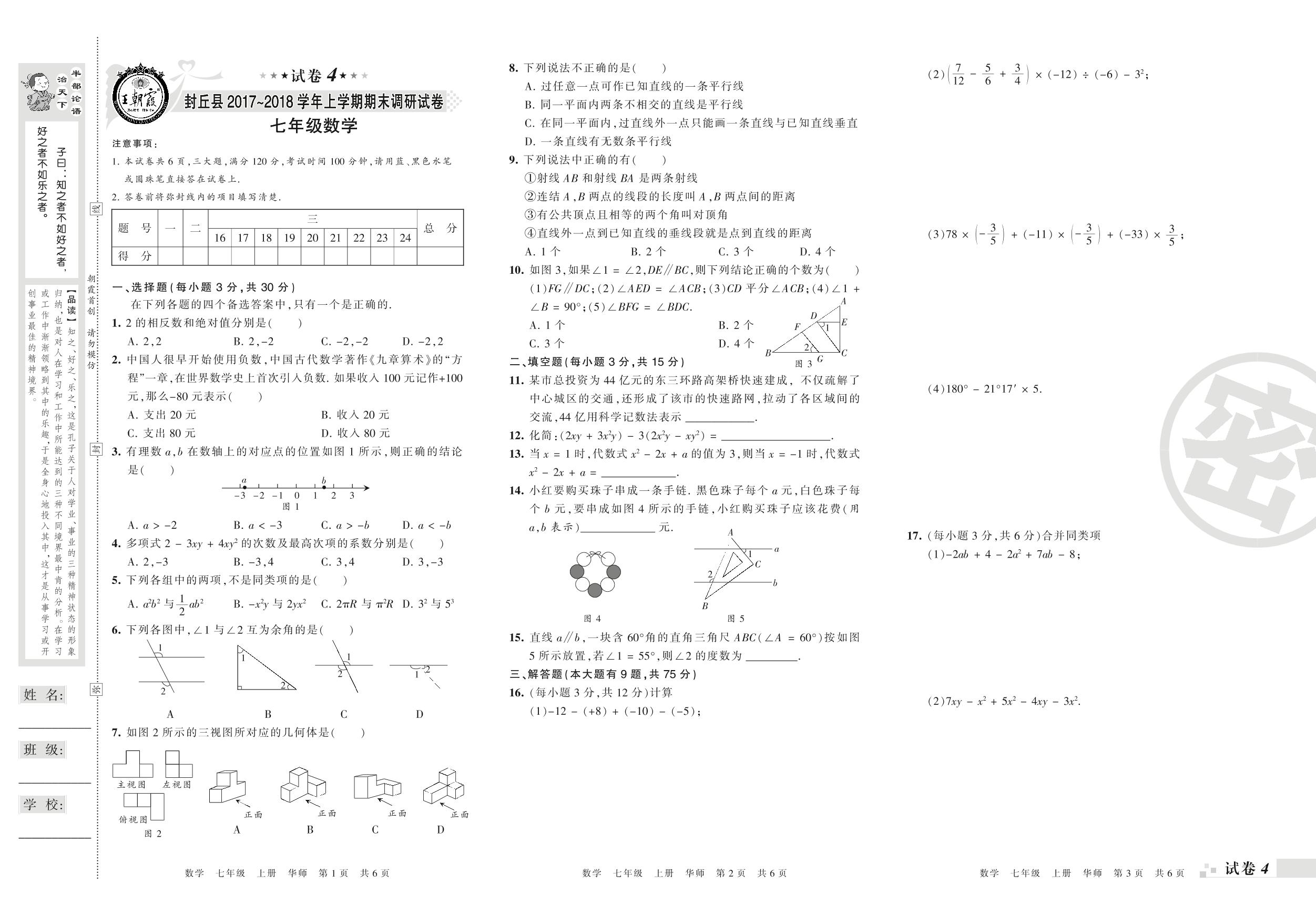 2017-2018学年第一学期新乡市封丘县七年级数学试卷(华师版)【4】