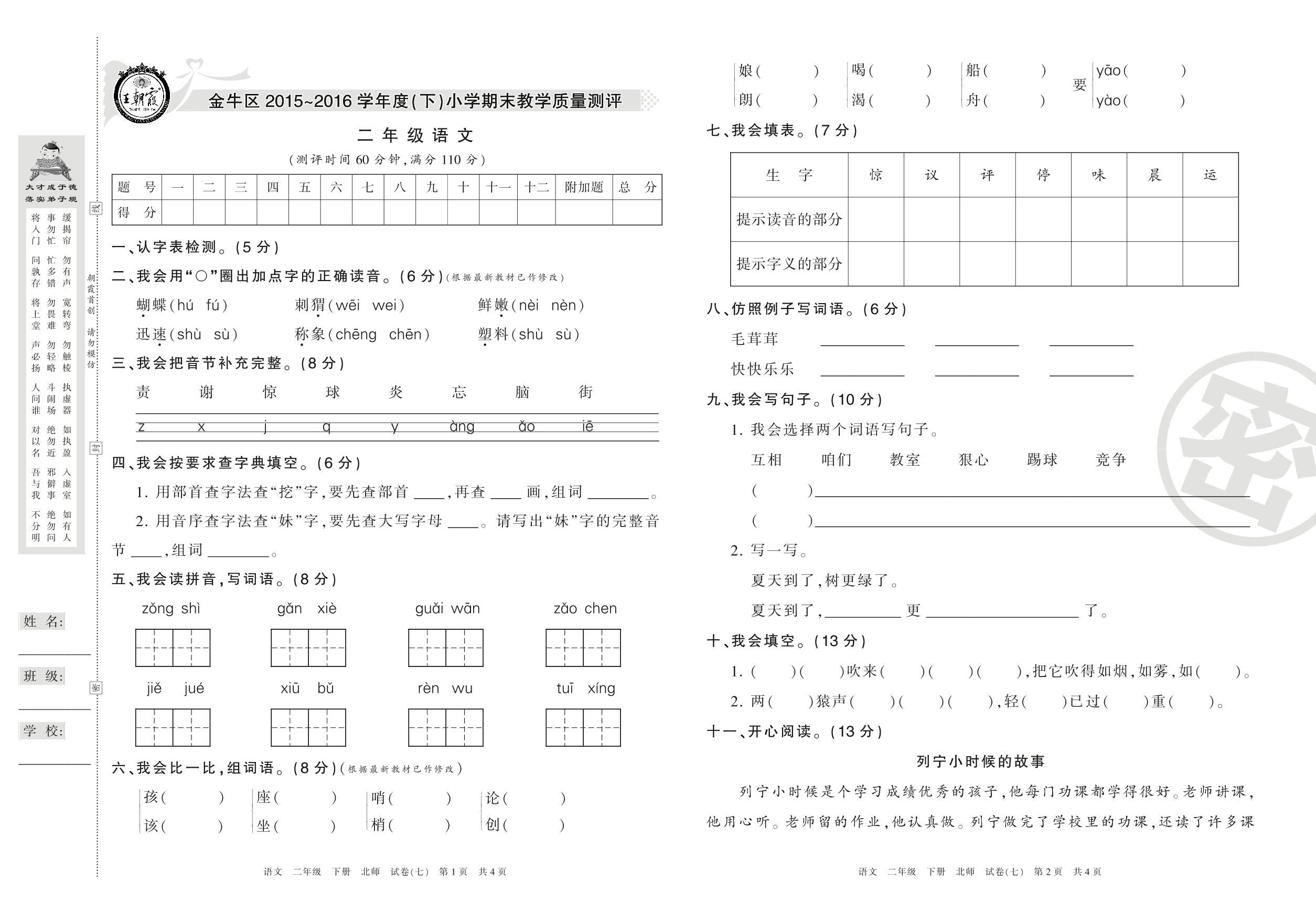 2015-2016学年第二学期成都市金牛区二年级语文试卷(北师版)【7】