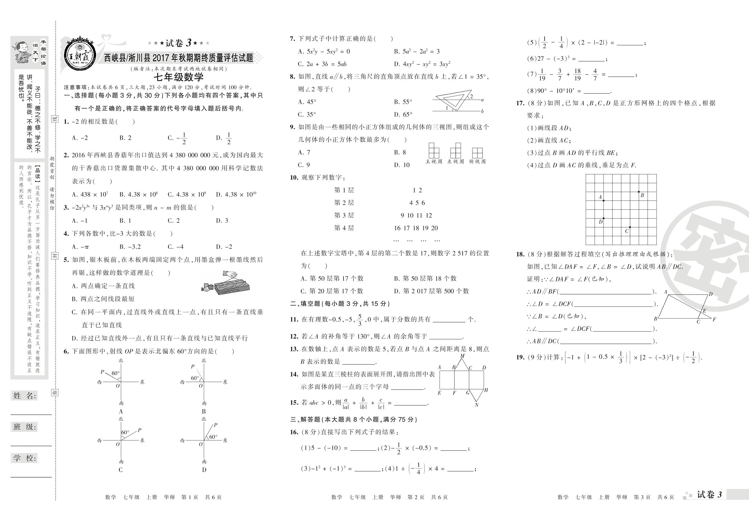 2017-2018学年第一学期南阳市西峡县、淅川县七年级数学试卷(华师版)【3】