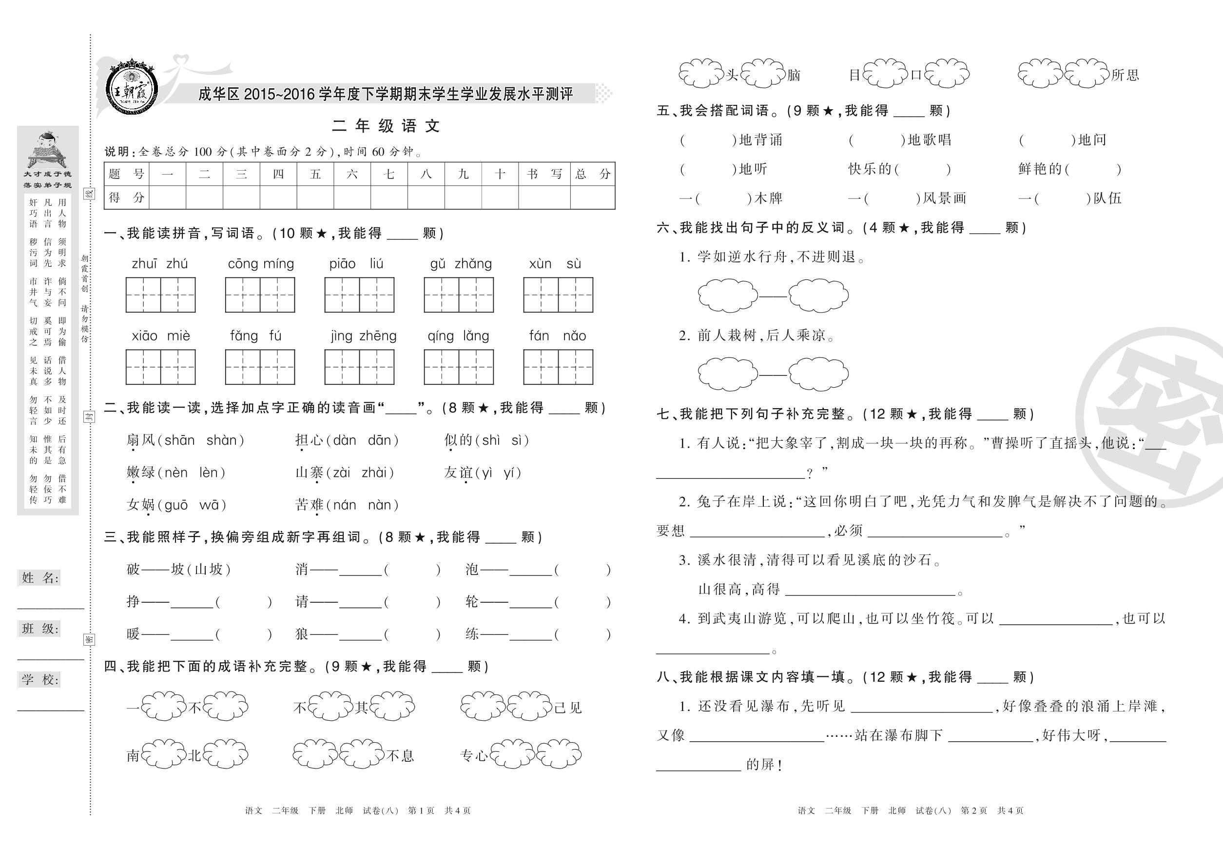 2015-2016学年第二学期成都市成华区二年级语文试卷(北师版)【8】