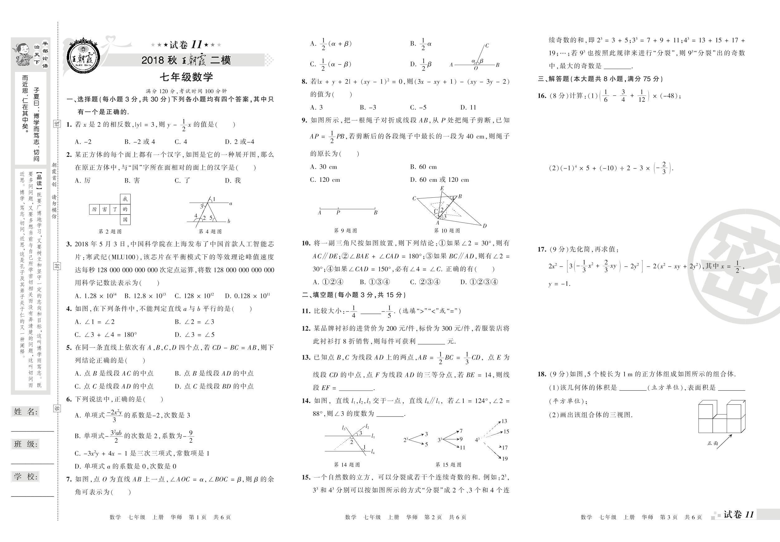 王朝霞期末模拟卷七年级上册数学(华师版)_R210805180750【11】