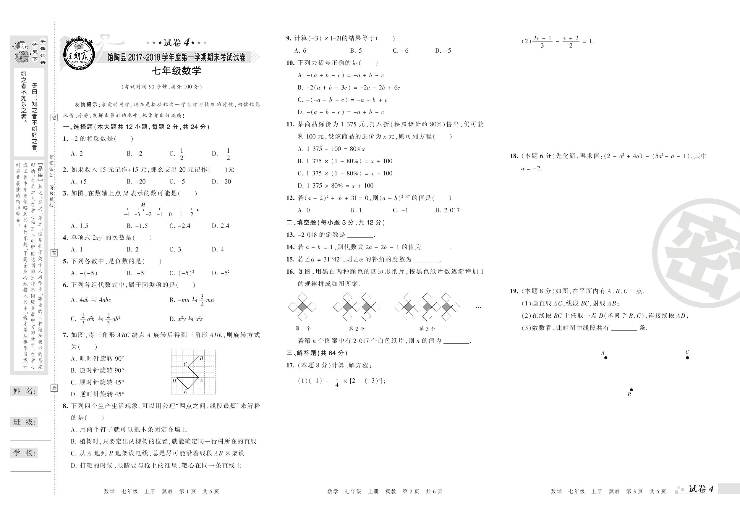 2017-2018学年第一学期邯郸市馆陶县七年级数学试卷(冀教版)【4】
