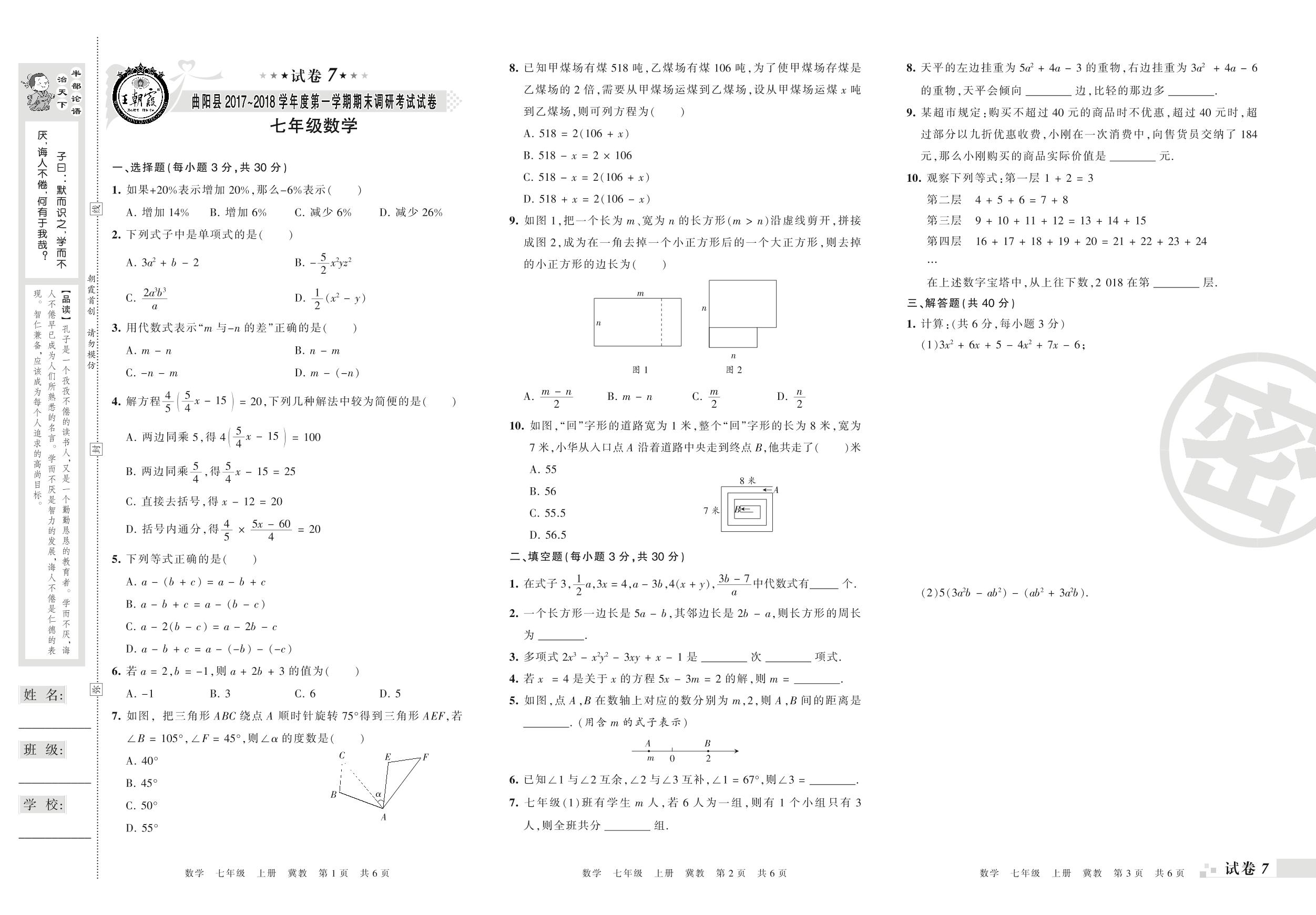 2017-2018学年第一学期保定市曲阳县七年级数学试卷(冀教版)【7】