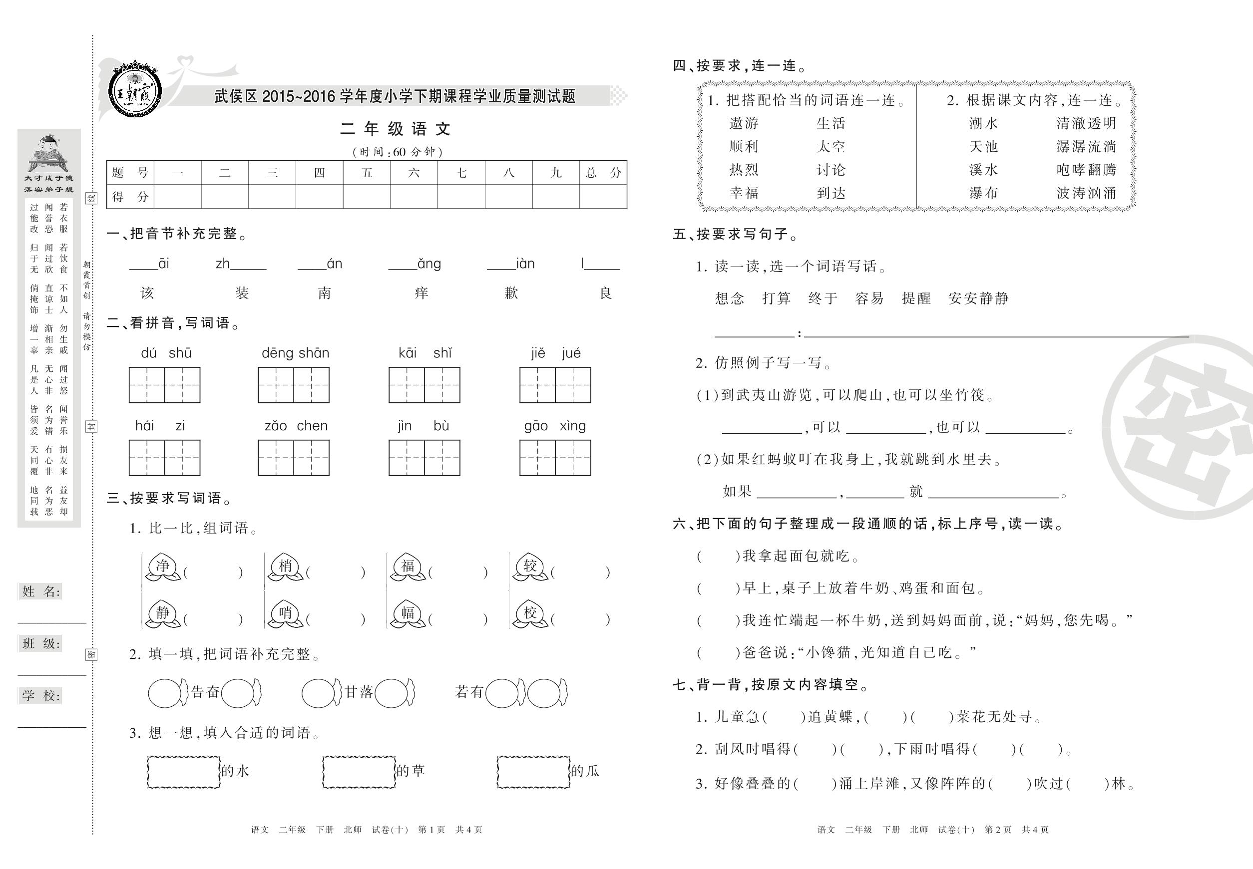 2015-2016学年第二学期成都市武侯区二年级语文试卷(北师版)【10】