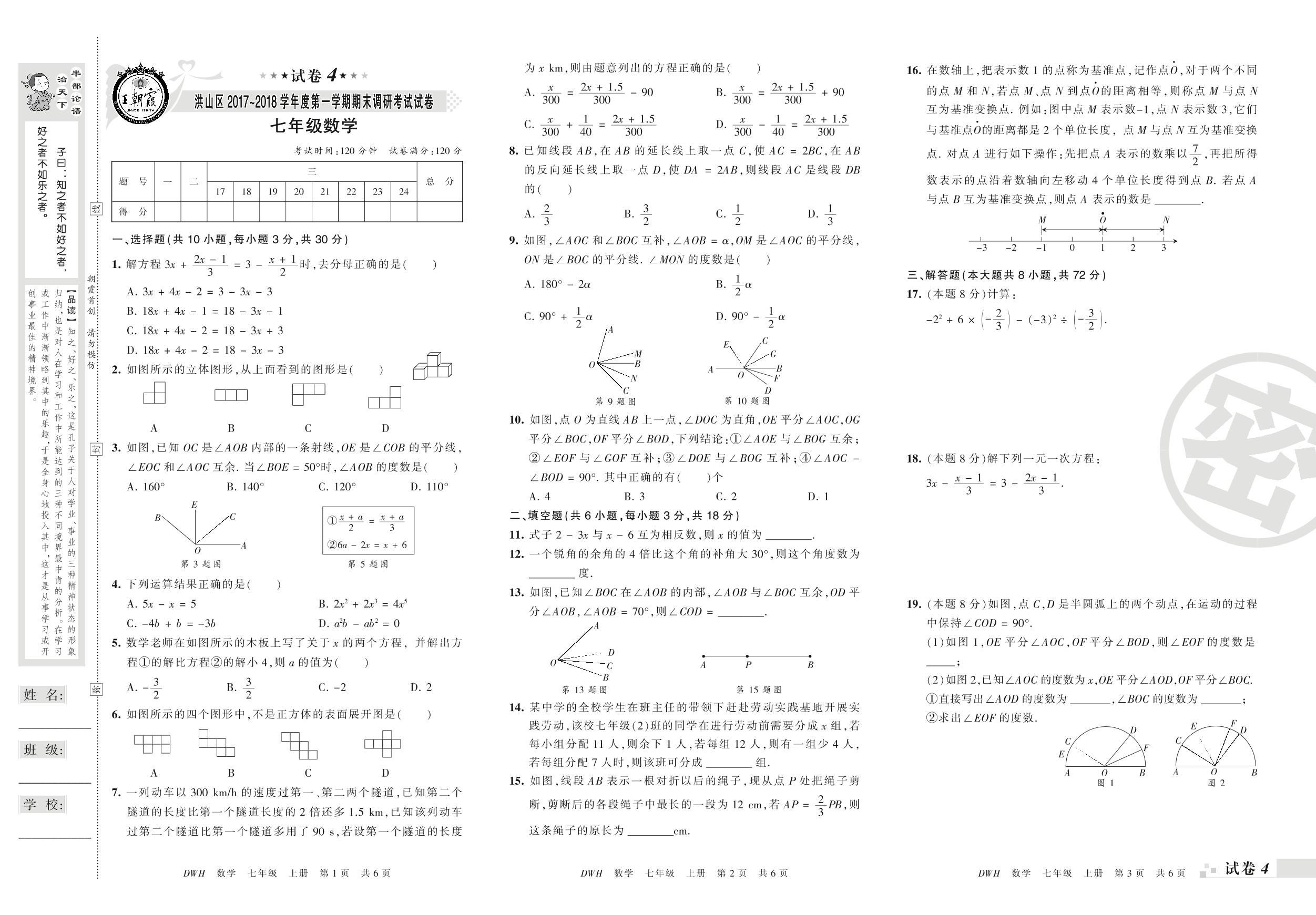 2017-2018学年第一学期武汉市洪山区七年级数学试卷(人教版)【4】