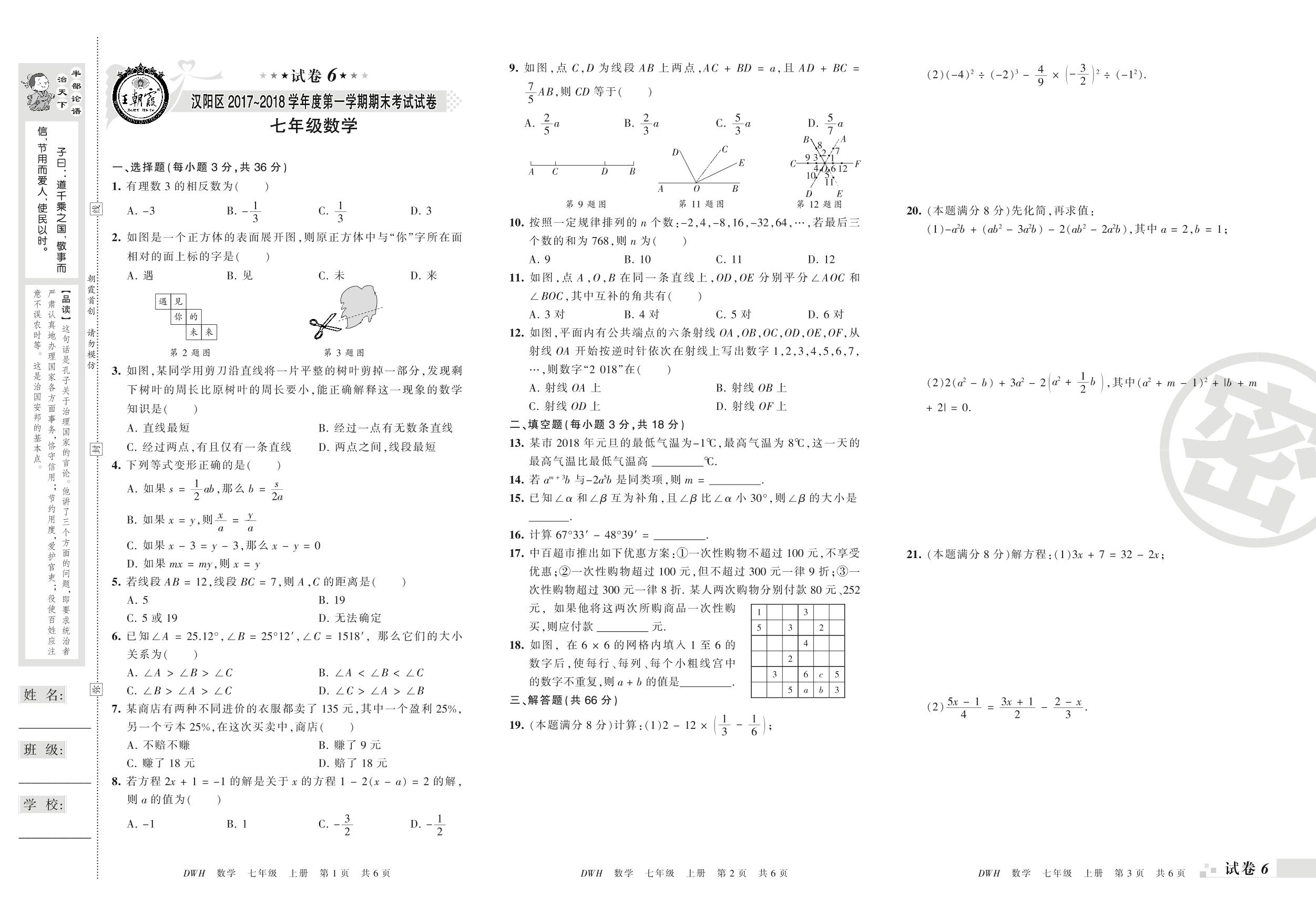 2017-2018学年第一学期武汉市汉阳区七年级数学试卷(人教版)【6】