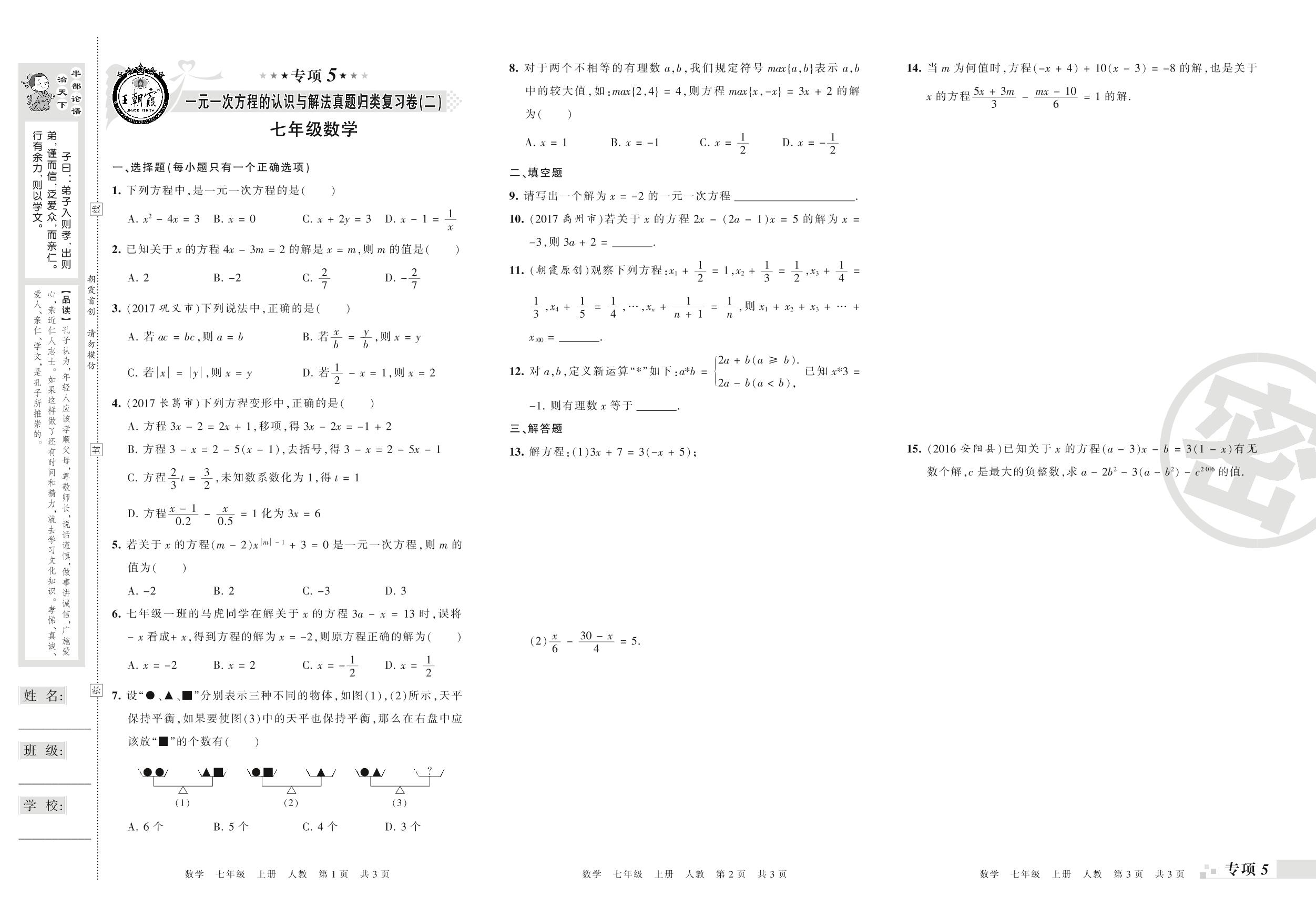 王朝霞期末专项卷——一元一次方程的认识与解法(二)、一元一次方程的应用真题归类复习卷七年级上册数学(人教版)_R210805181117【0】